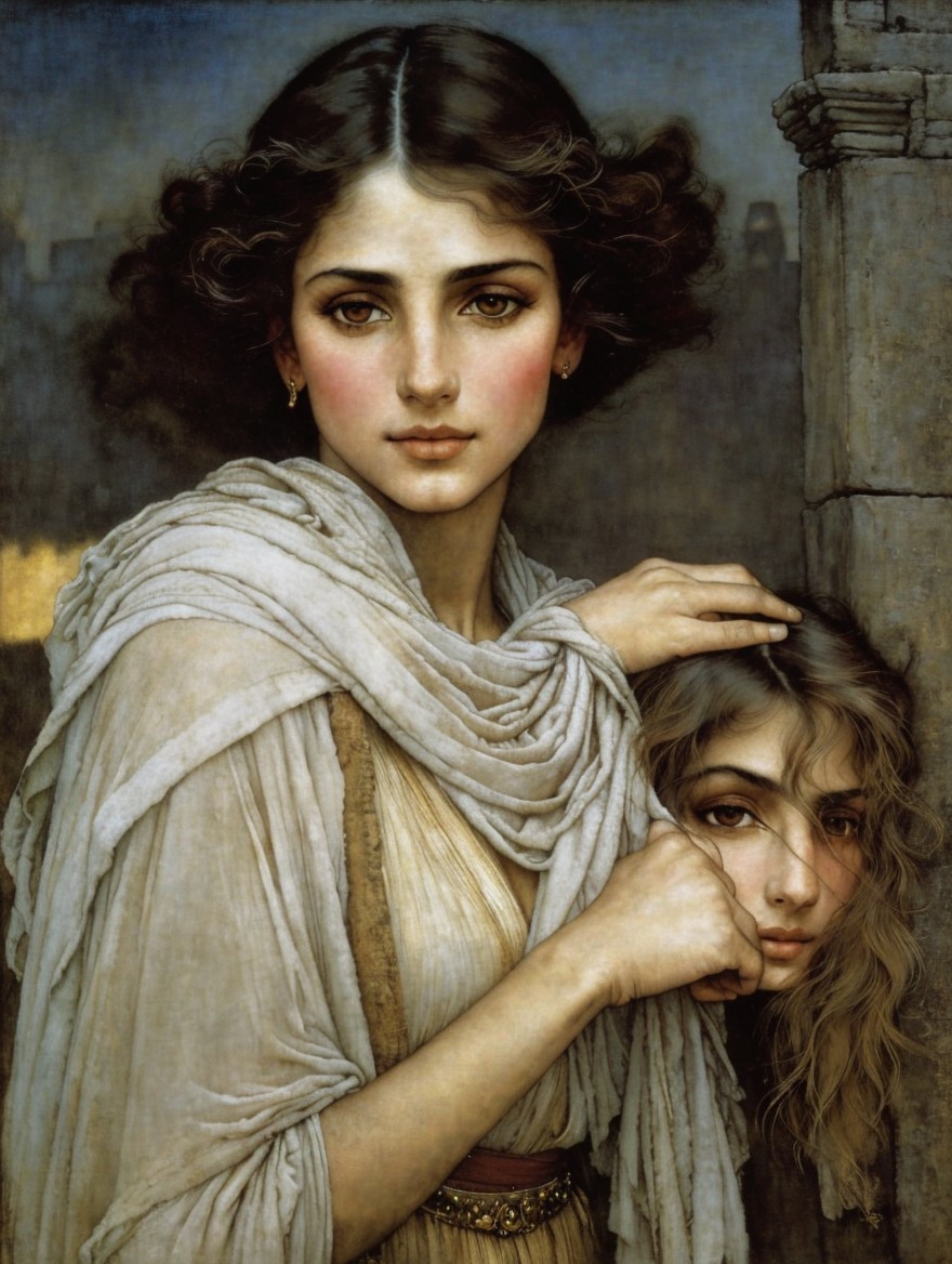 A painting of a woman with wavy hair, captivating eyes, draped in a white shawl against a blue and stone background.