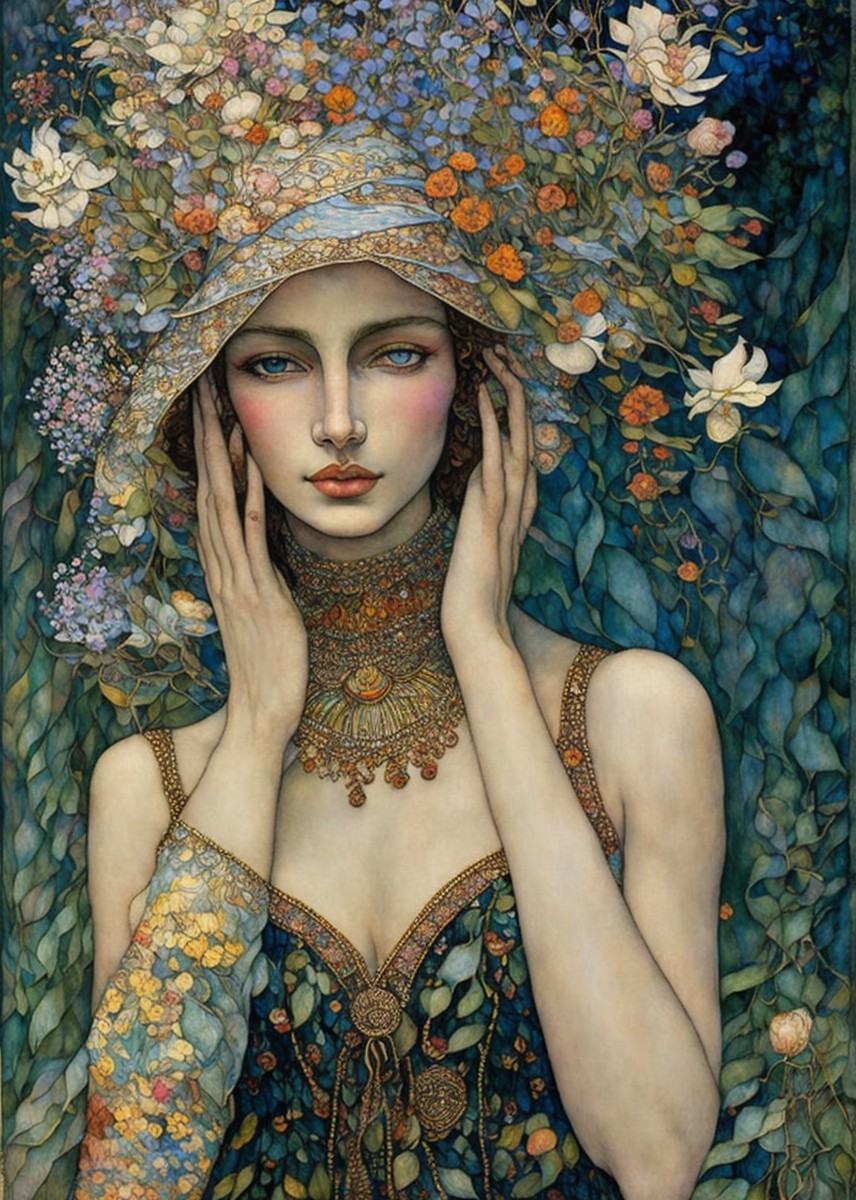 An illustration of a woman with sunflower headdress, ornate jewelry, and a vintage dress, featuring intricate designs and a muted color palette.
