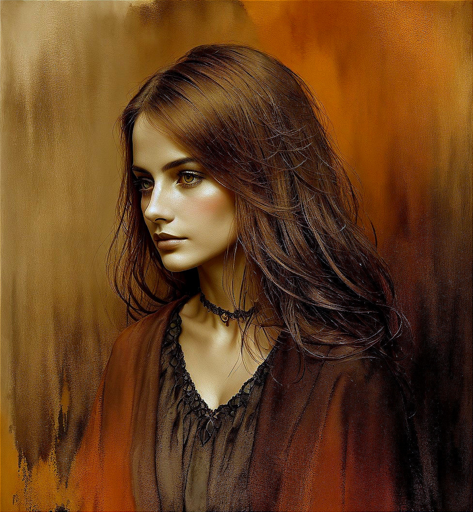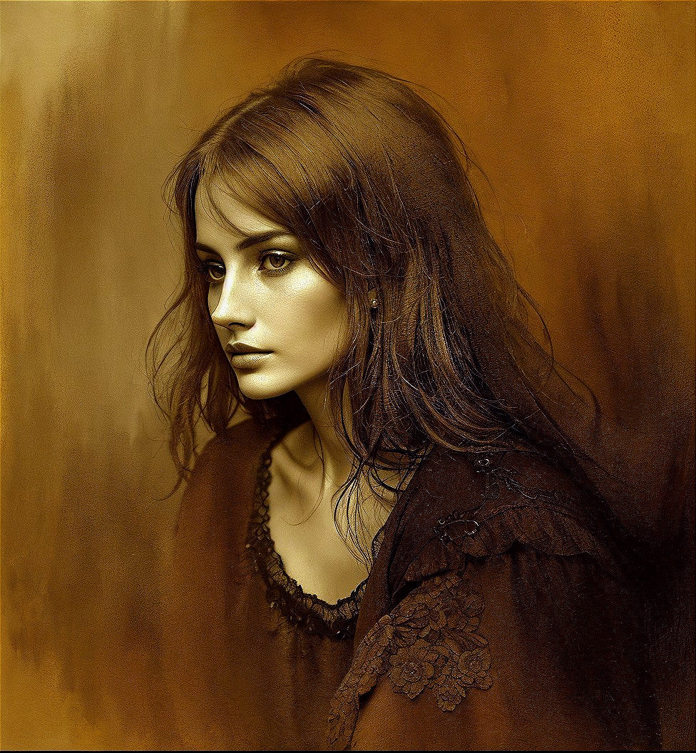 + Prompt:Beautiful woman's portrait in ochre, garden, Art Brut, moody, somber, desaturated colors, in the style of Paul Klee, Arthur Rackham