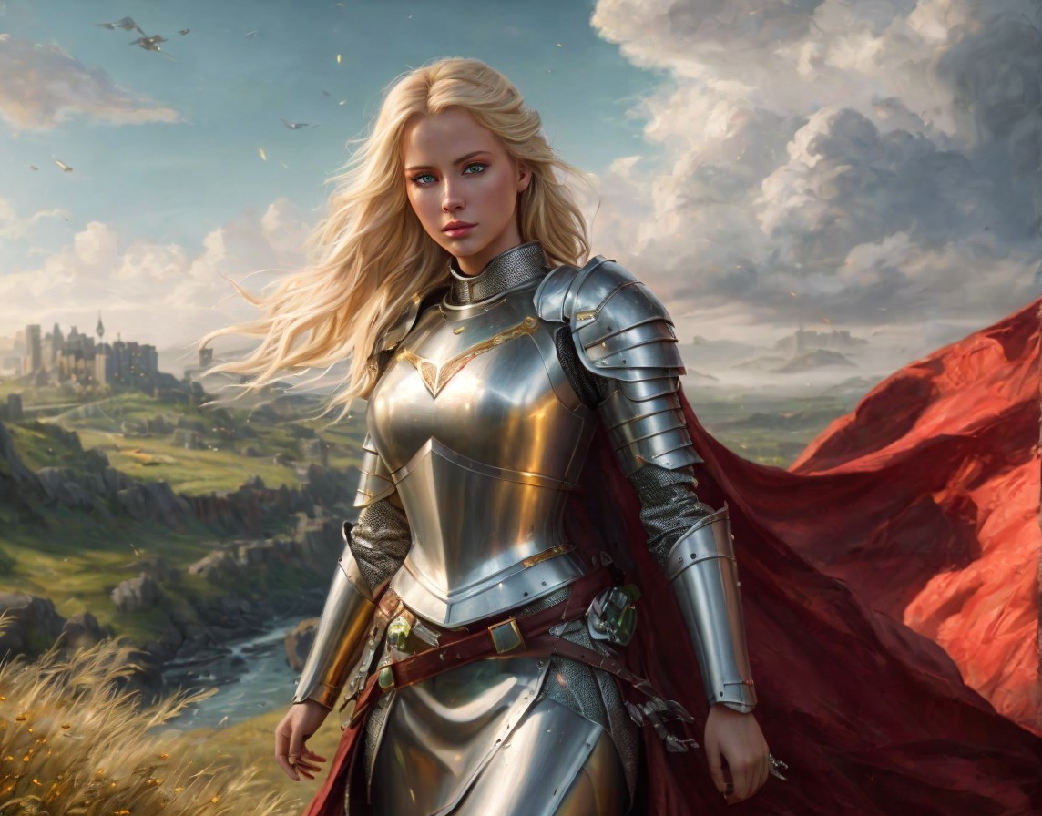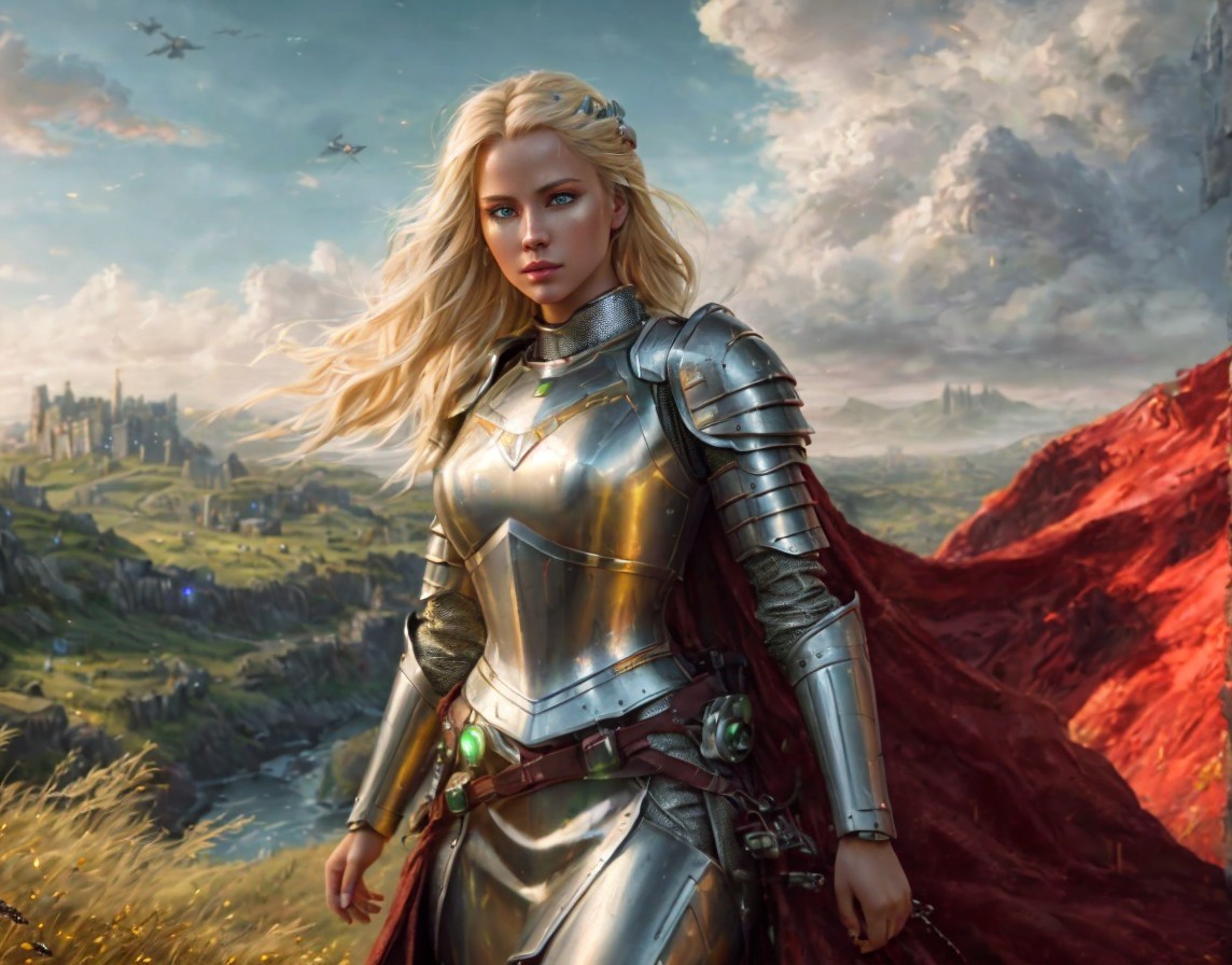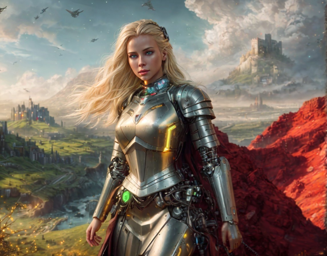 A beautiful android in cybernetic medieval plate armor. She stands between two worlds. She is framed on one side by a techno-utopian image and an apocalyptic technological manifestation on the other.