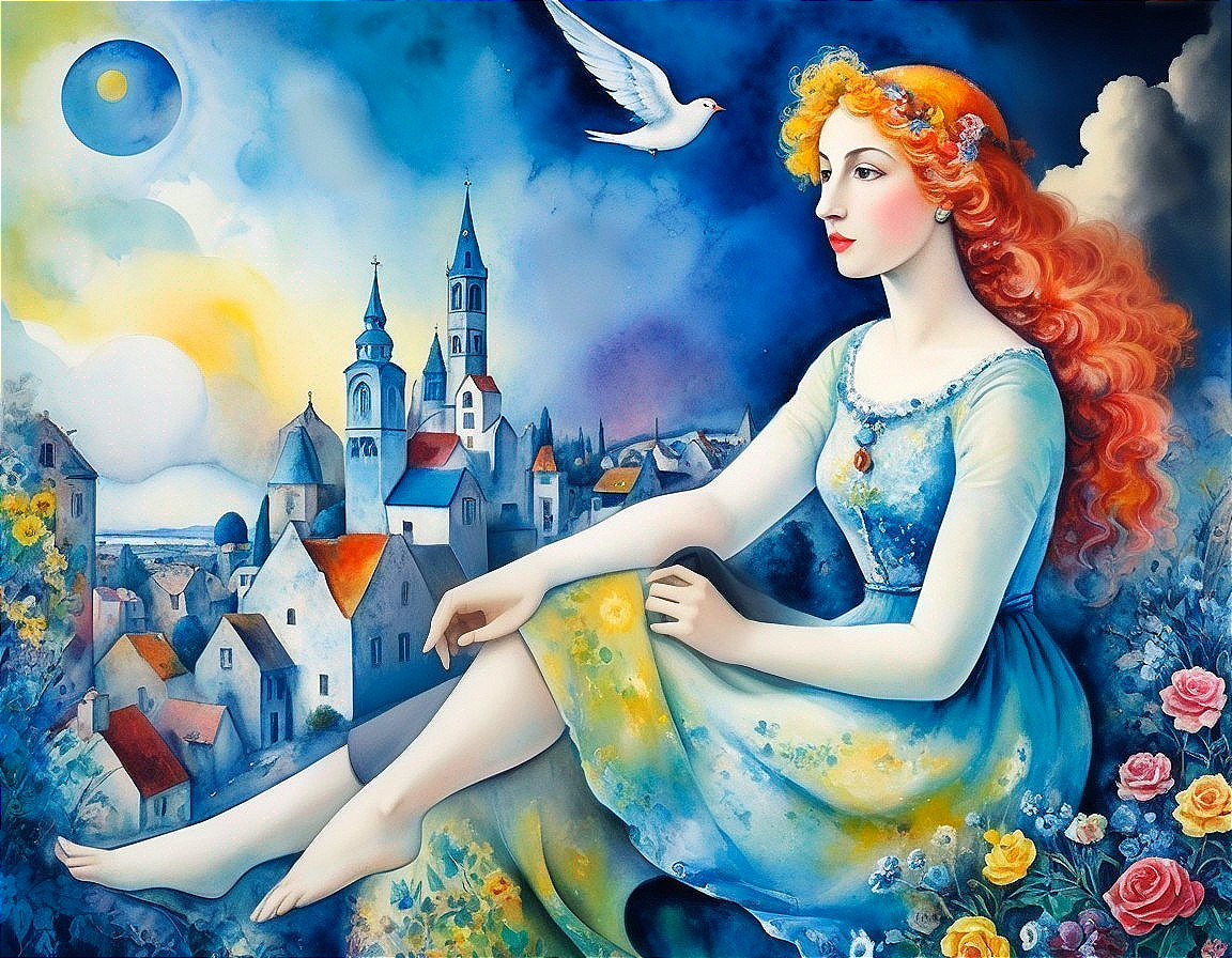 A painting of a red-haired woman in a yellow dress sitting before a stylized town with a dove flying overhead under a sunny sky.