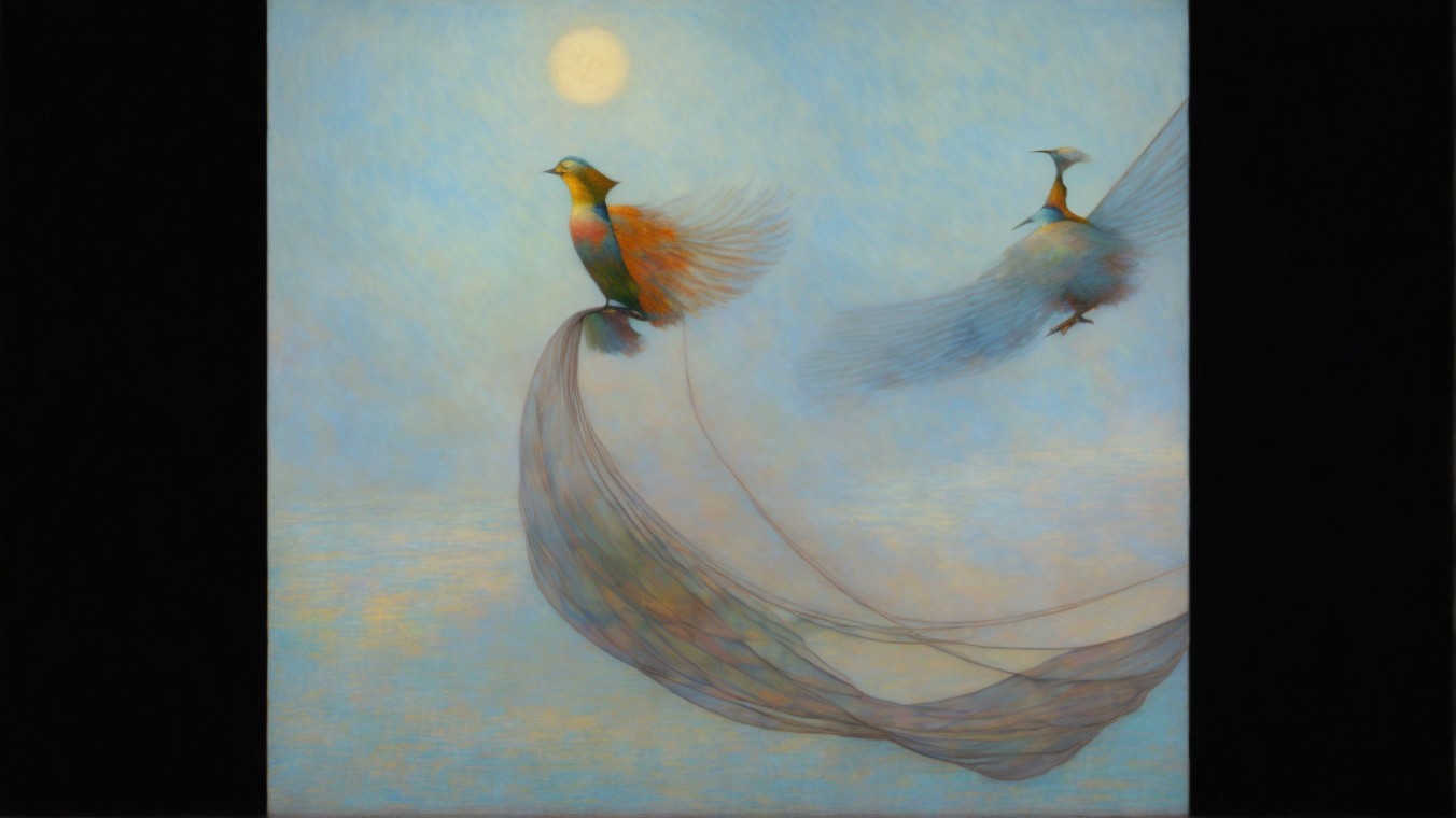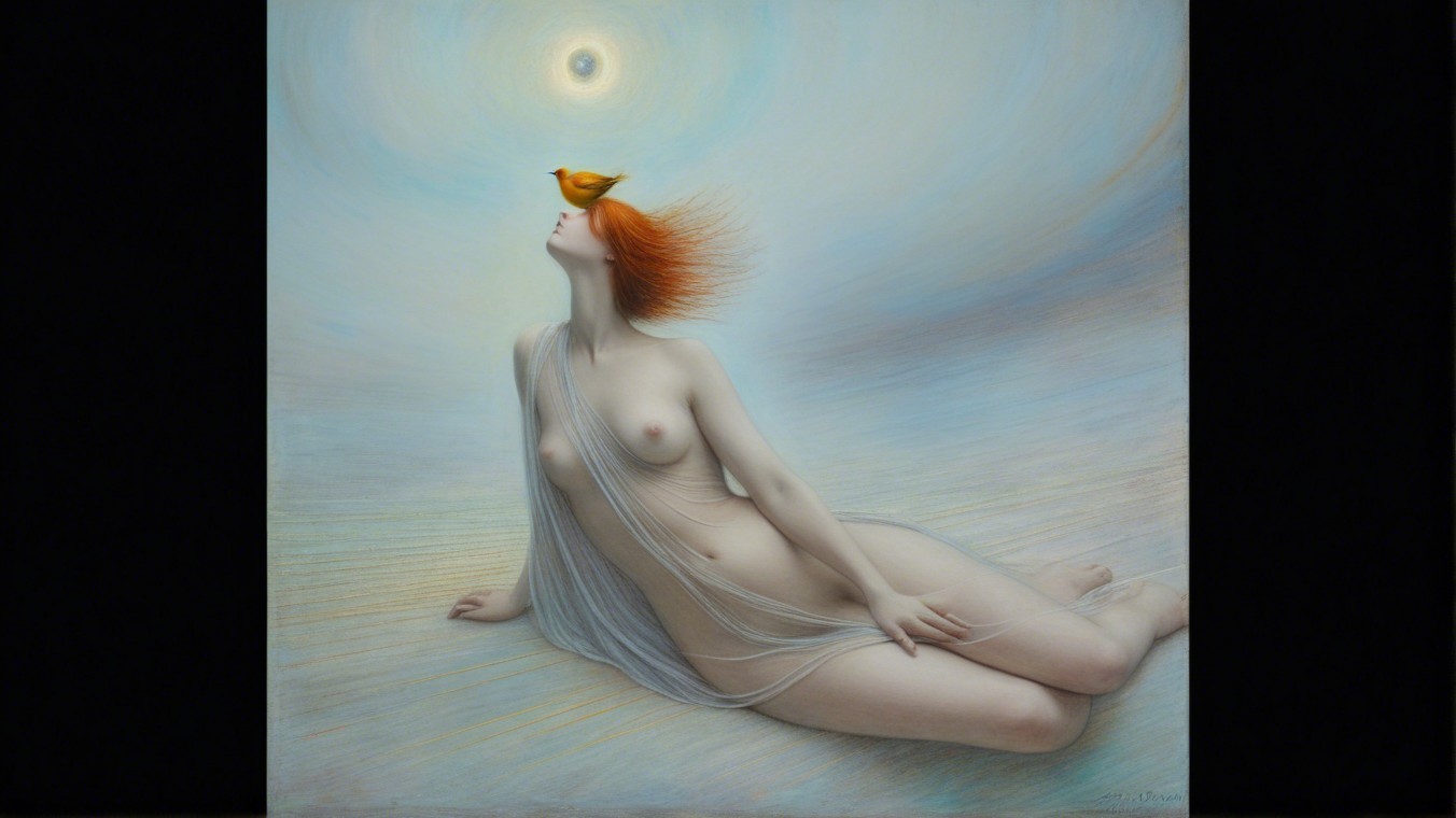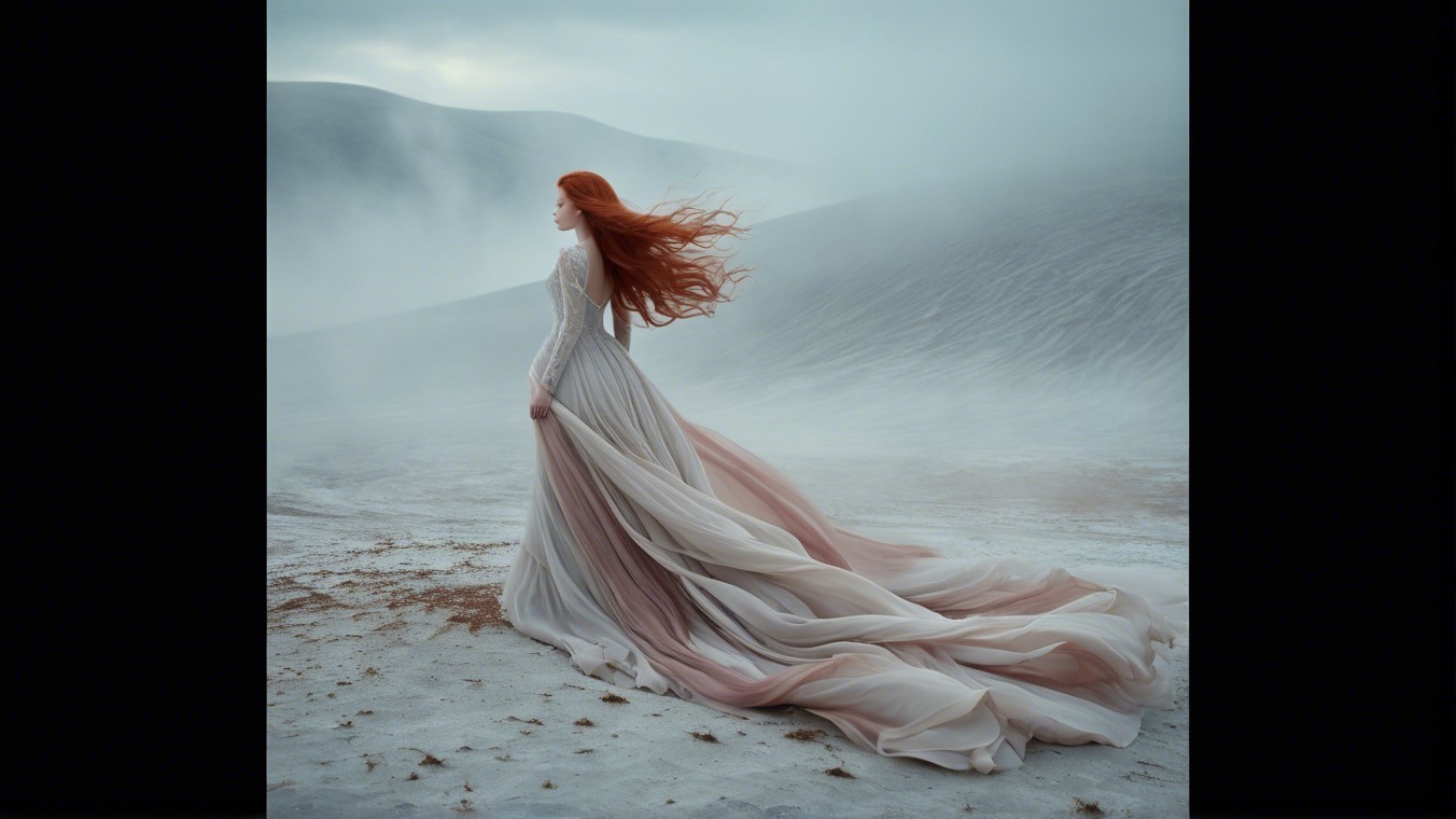 A serene scene of a woman in a flowing dress, standing by a tranquil water body. Her hair billows in the breeze, and musical notes dance around her, harmonizing with the sunlit sky.