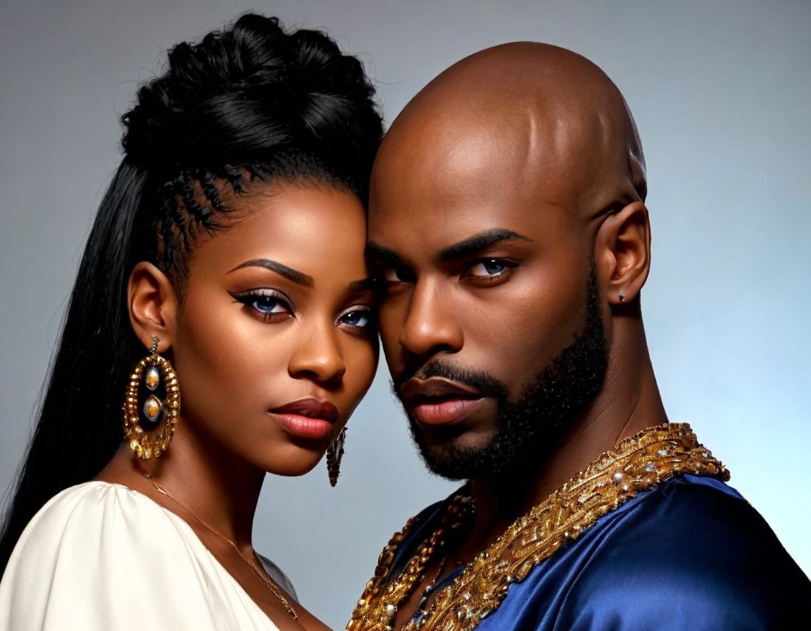 A striking portrait of a stylish couple with bold hairstyles, wearing elegant attire and jewelry. Their intense expressions convey a powerful connection, set against a softly lit background.