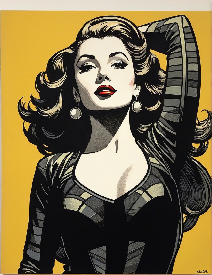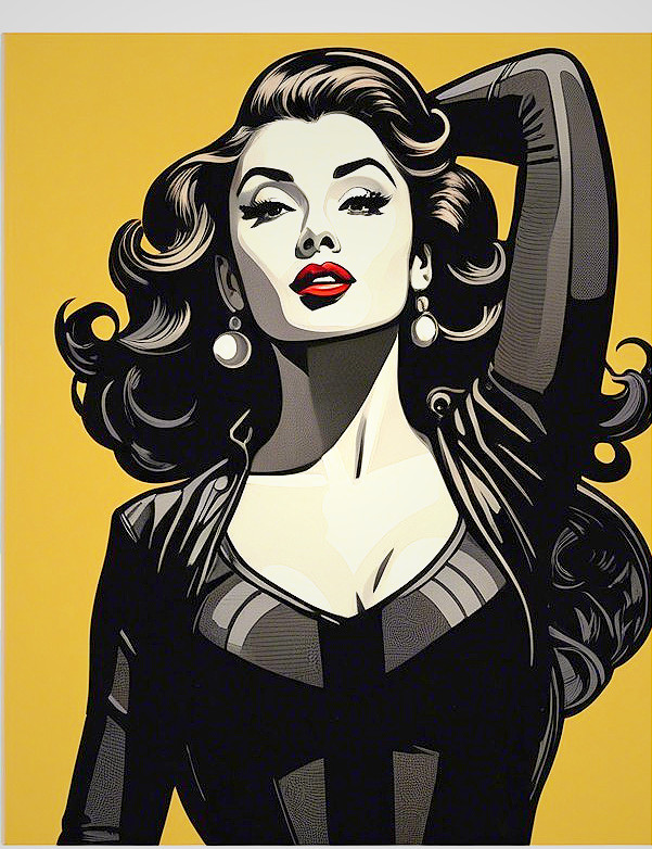 A glamorous woman strikes a confident pose against a bright yellow background. She has voluminous hair, bold red lips, and is dressed in a stylish, form-fitting outfit, exuding classic allure.