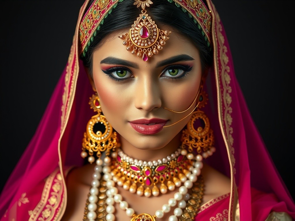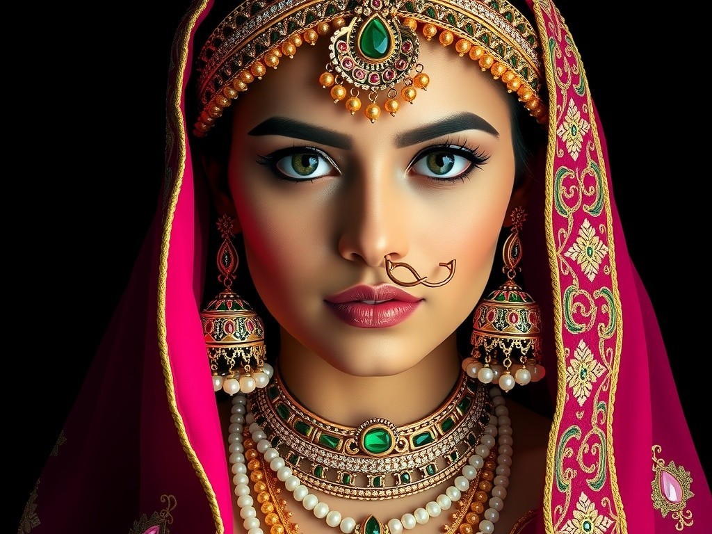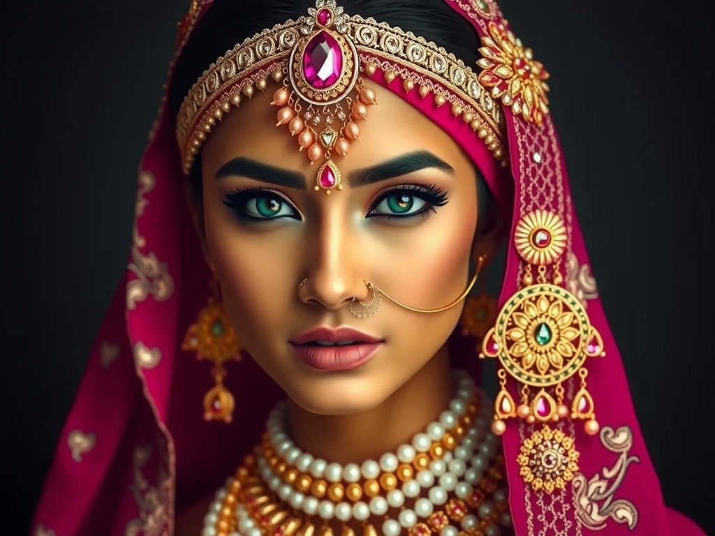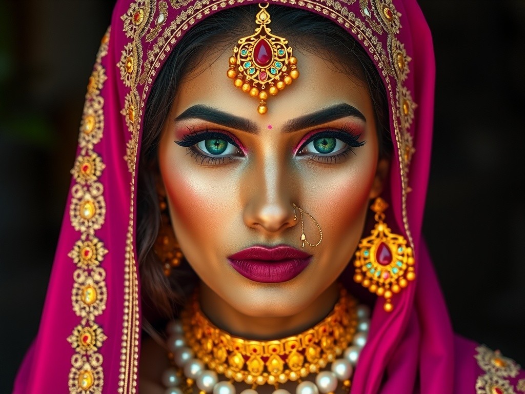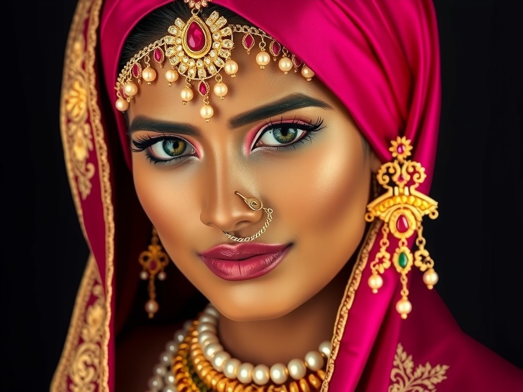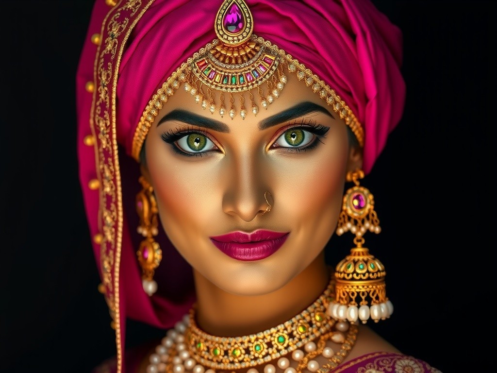 The portrait depicts a woman with olive skin, sharp features, and striking emerald eyes. Adorned in a regal fuchsia headwrap with gold embellishments, intricate jewelry, and a luxurious traditional outfit, she exudes elegance and cultural richness against a dark backdrop.