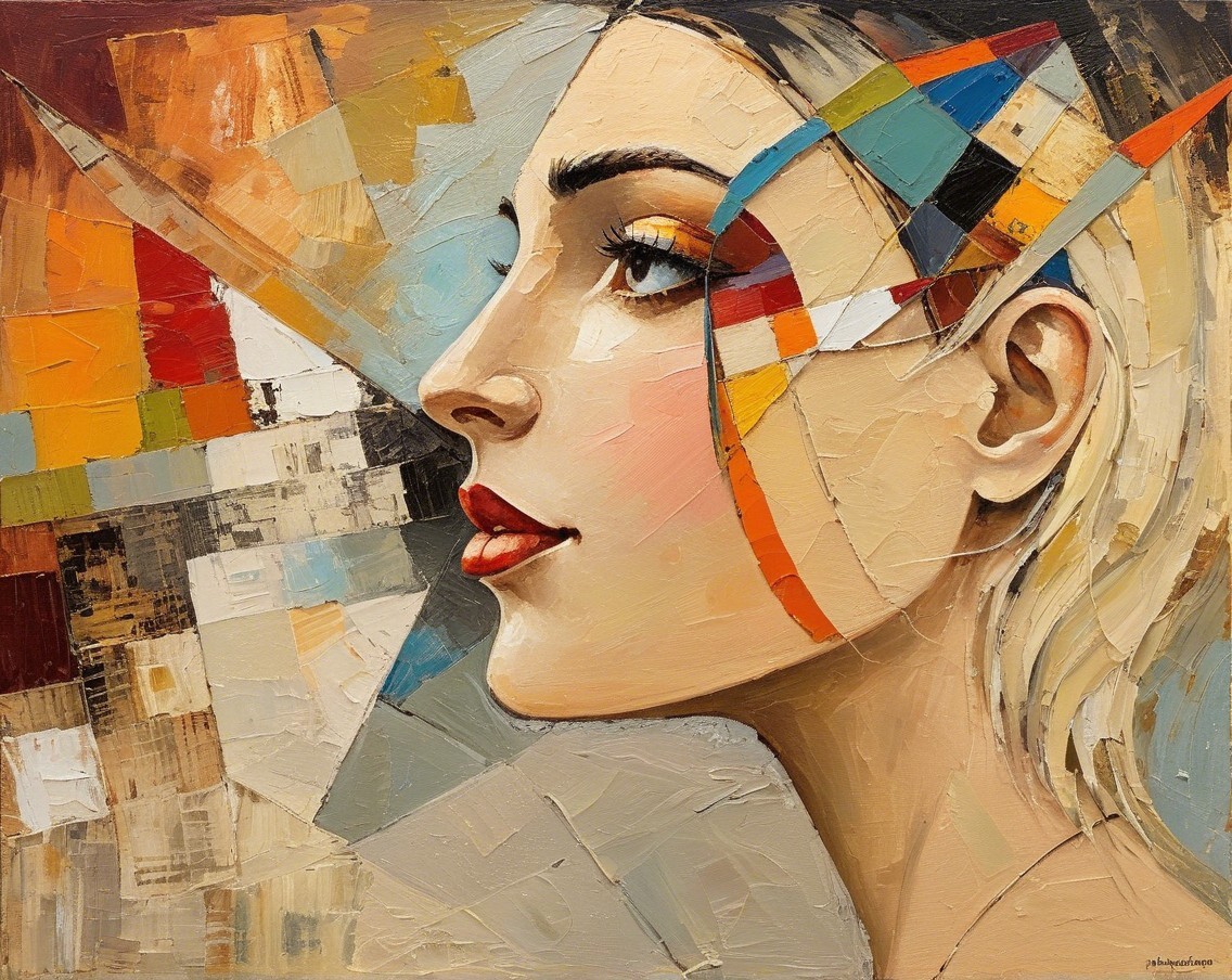 Angular shapes and bold colors convey the fragmented state of dreams evoked by the abstract female subject,