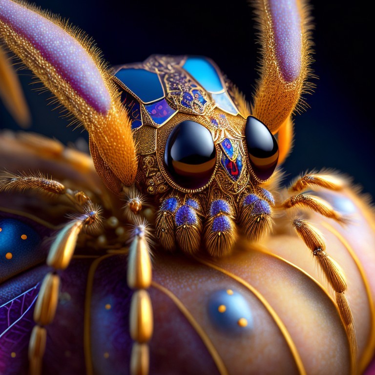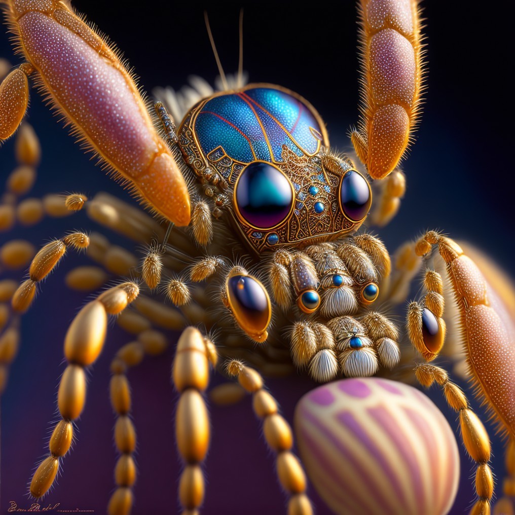 A highly detailed illustration of a spider with metallic hues on its body and reflective, colorful eyes, set against a dark background.