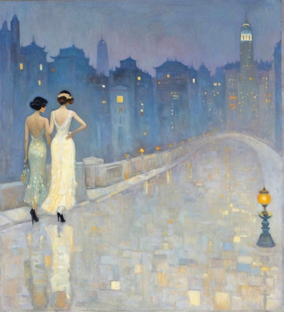 The painting depicts two elegantly dressed women in vintage attire walking through a foggy city street at night, with the iconic Empire State Building glowing in the background.