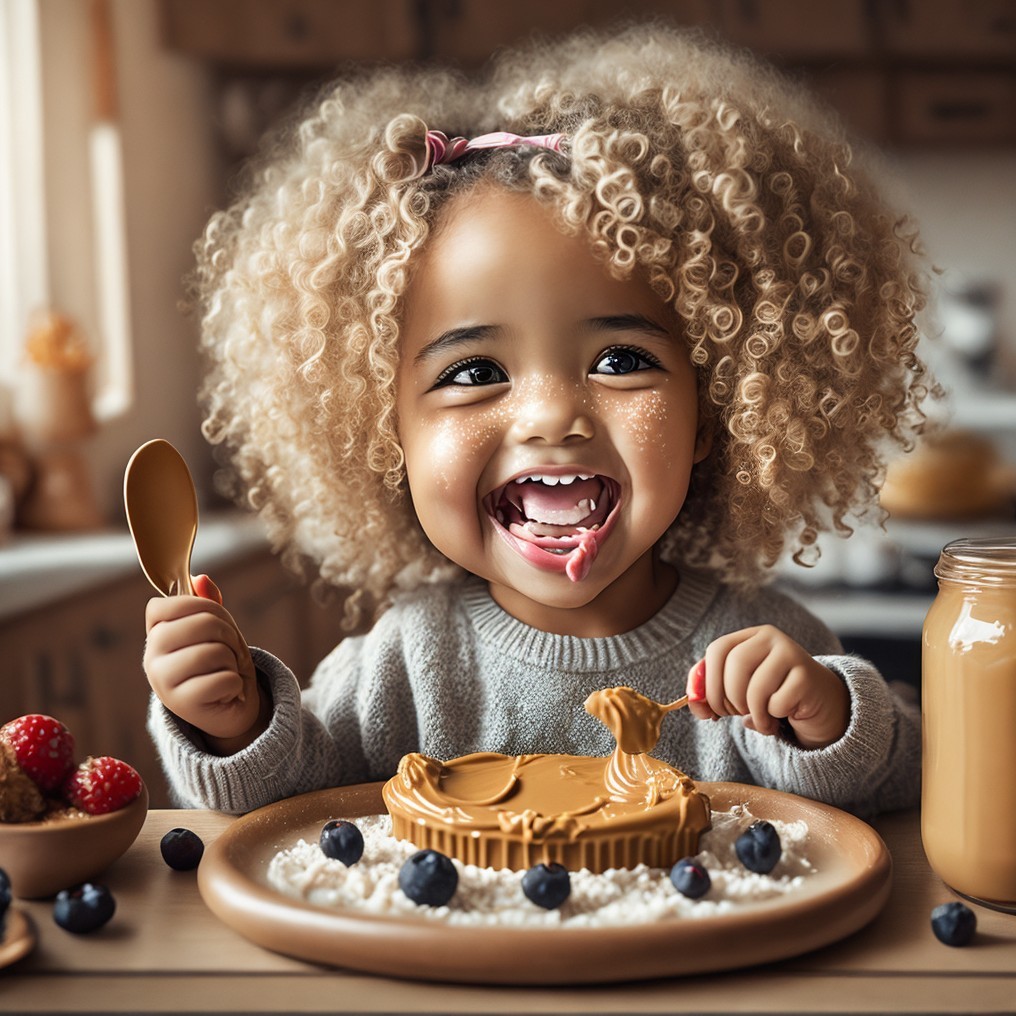 A joyful child with curly hair is eating peanut butter, making a messy yet amusing scene.