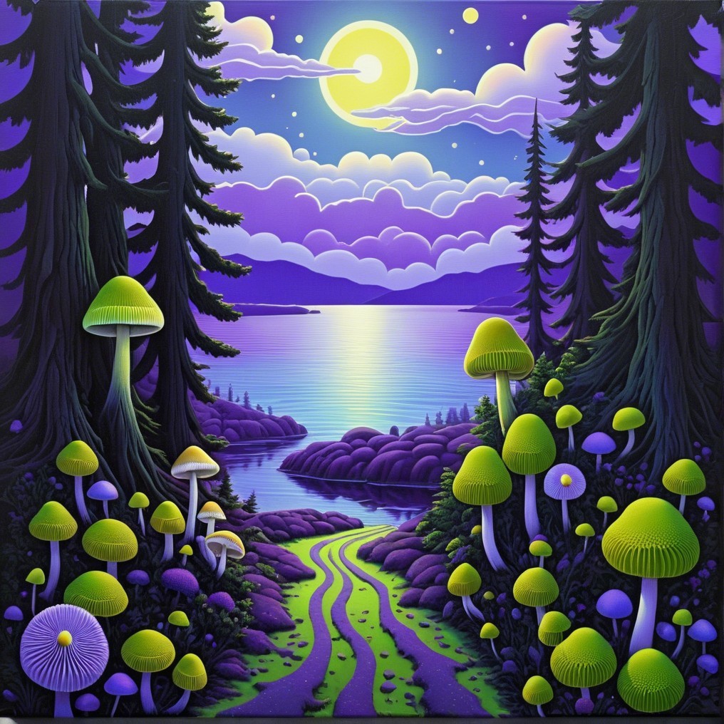 A vibrant landscape featuring towering trees and surreal, brightly colored mushrooms lining a winding path. The moon glows over a tranquil lake, reflecting purple and blue hues in the sky.