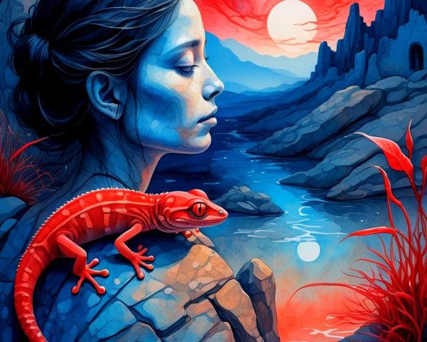 A serene figure in a flowing, ethereal dress walks gracefully along a tranquil, misty landscape, with soft colors of blue and gold reflecting in the water, evoking calmness and beauty.