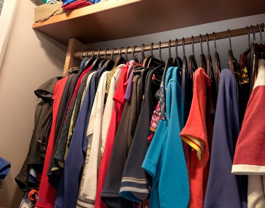 A closet filled with colorful clothes on hangers and neatly stacked on shelves, showcasing a variety of garments and sizes.
