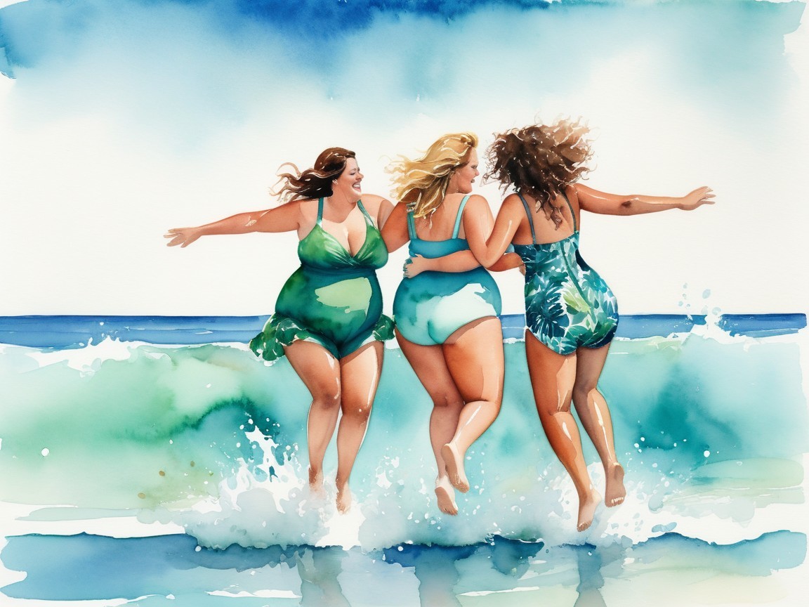 Three joyful women leap into the ocean waves, wearing vibrant swimsuits. They exude happiness and camaraderie against a bright blue sky and shimmering water.