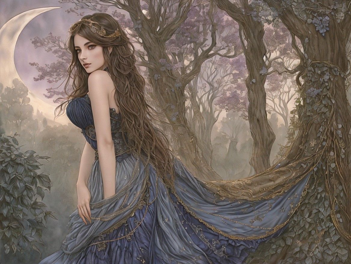 A woman in a flowing blue gown sits by a balcony with a twilight sky and full moon, her hair billowing, evoking a dreamy, romantic atmosphere.