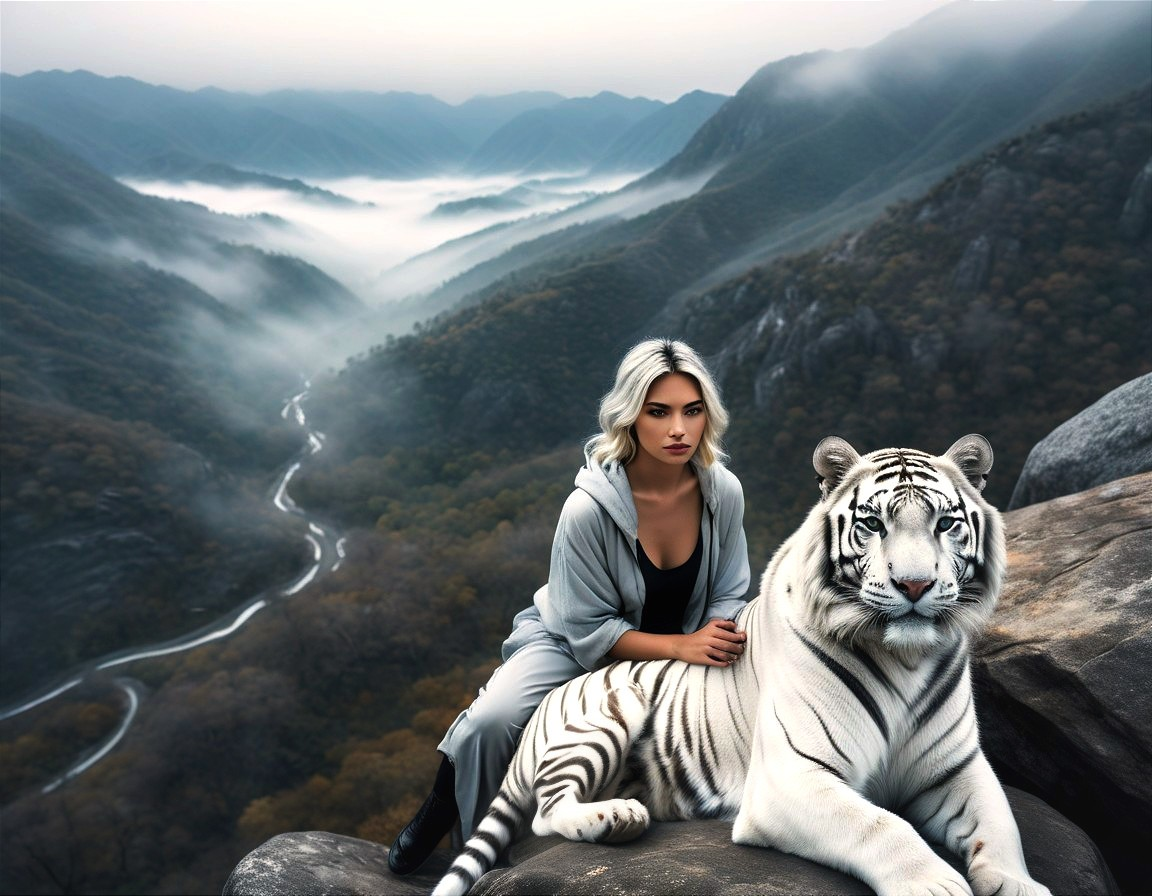 1515151: Ethereal photography of a woman sitting with a white tiger on a rock {shrouded in an eerie ambiance, shot from above with a wide angle lens against a foggy mountain backdrop}{photography in the style of detailed hyperrealism, stylish, dark, full-body photography, valley, foggy, shrouded in fog, mountains, soft light, futurism}[by Louise Bourgeois, Anish Kapoor, expressive, hyper detailed, intricate, artstation, dof, original phenomenal masterwork with virtuoso details]