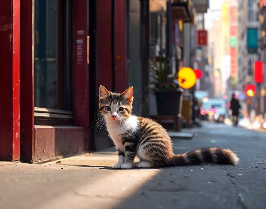 Two cats on a sunny city street, one in foreground looking curious, the other resting in the background.