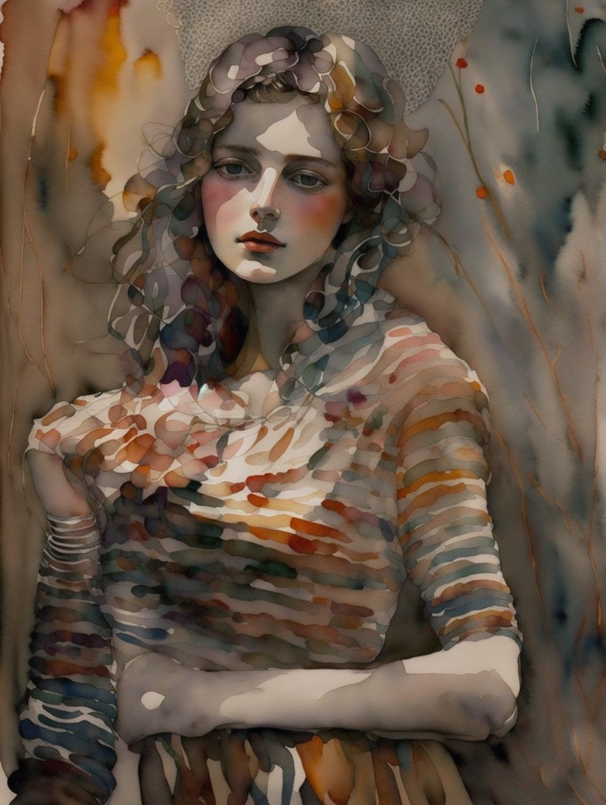A watercolor painting of a woman with wavy hair, wearing a striped top, with a soft, contemplative gaze, against a blurred background.
