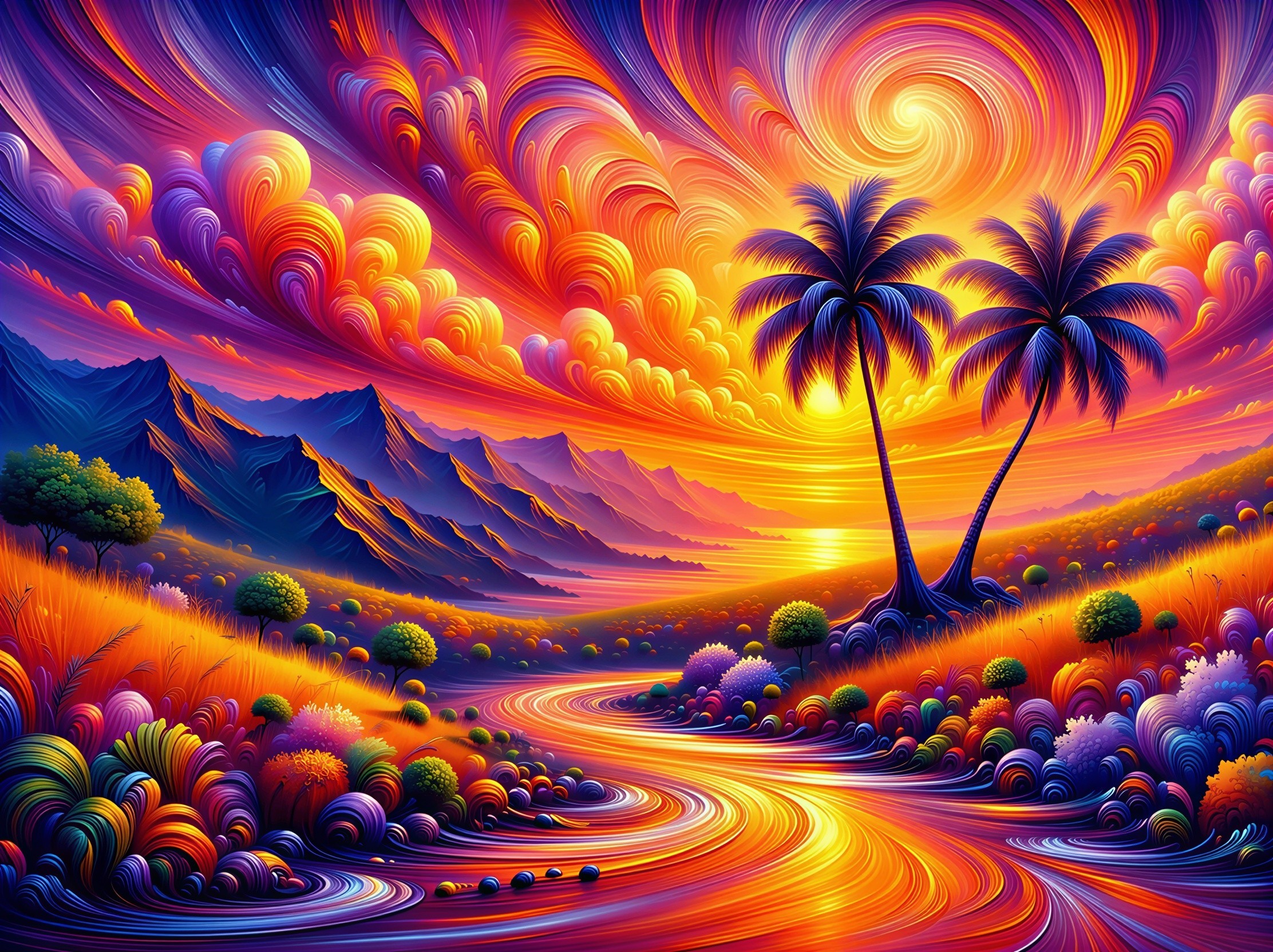 A vibrant and surreal landscape painting depicts a sunset over a tropical valley. The sky is filled with swirling, multicolored clouds in shades of purple, blue, orange, yellow, and fuchsia, with a bright orange sun setting on the horizon, casting a warm glow. Two silhouetted palm trees stand