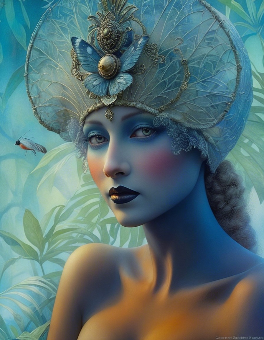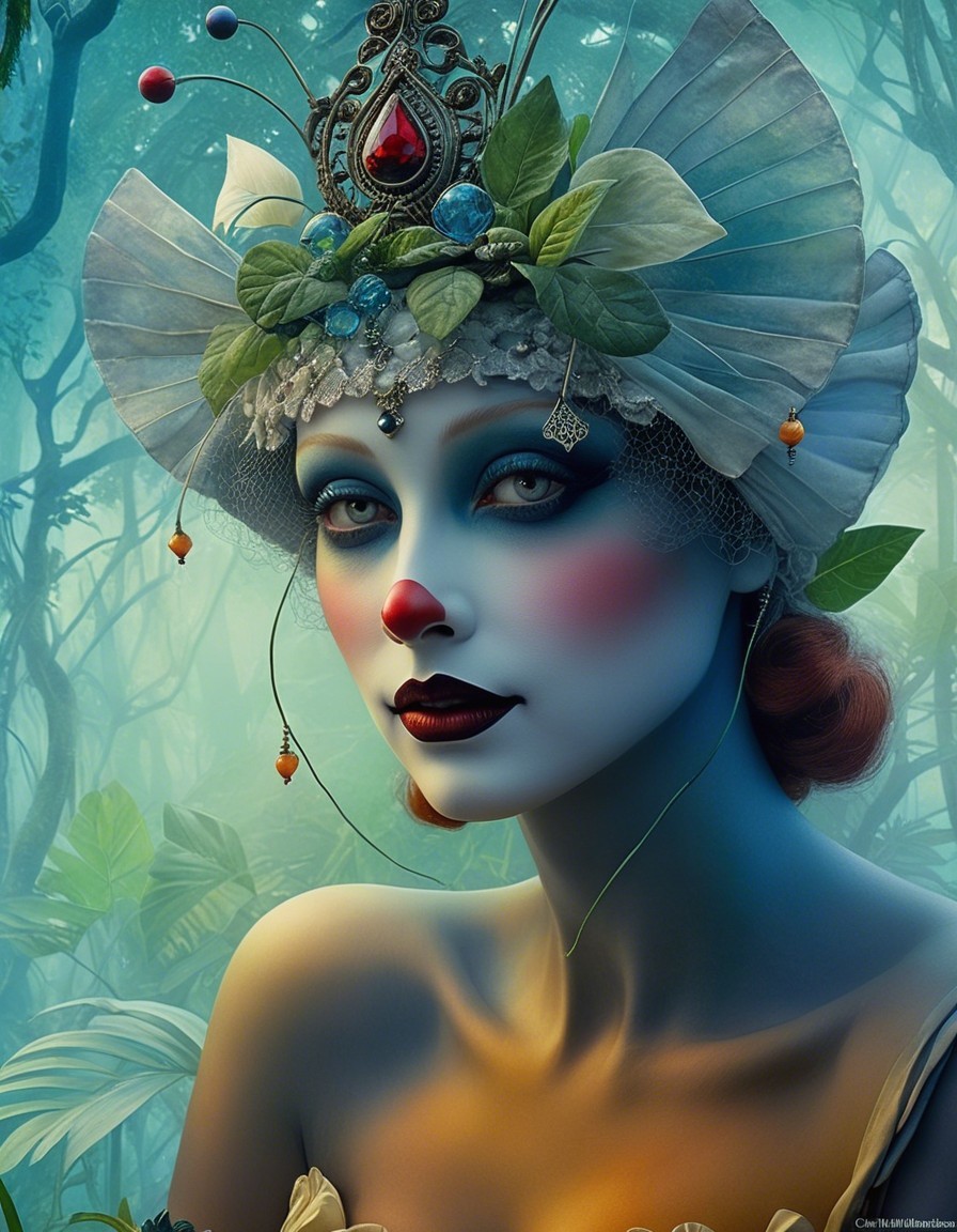 Close up, impish devious beautiful Pierrot creature in a garden jungle maze, in the style of Alexander Jansson. by Catrin Welz-Stein, Michael Parkes