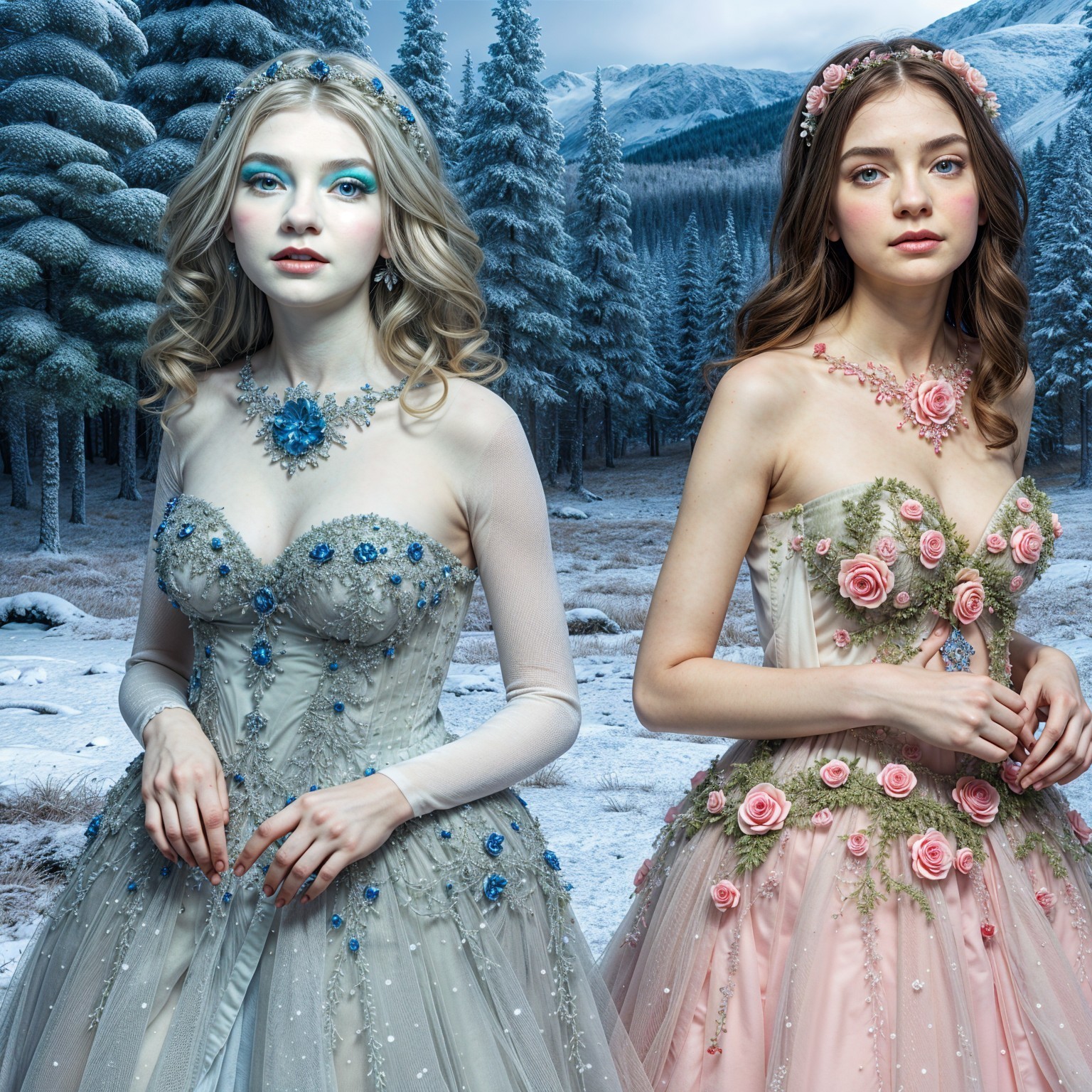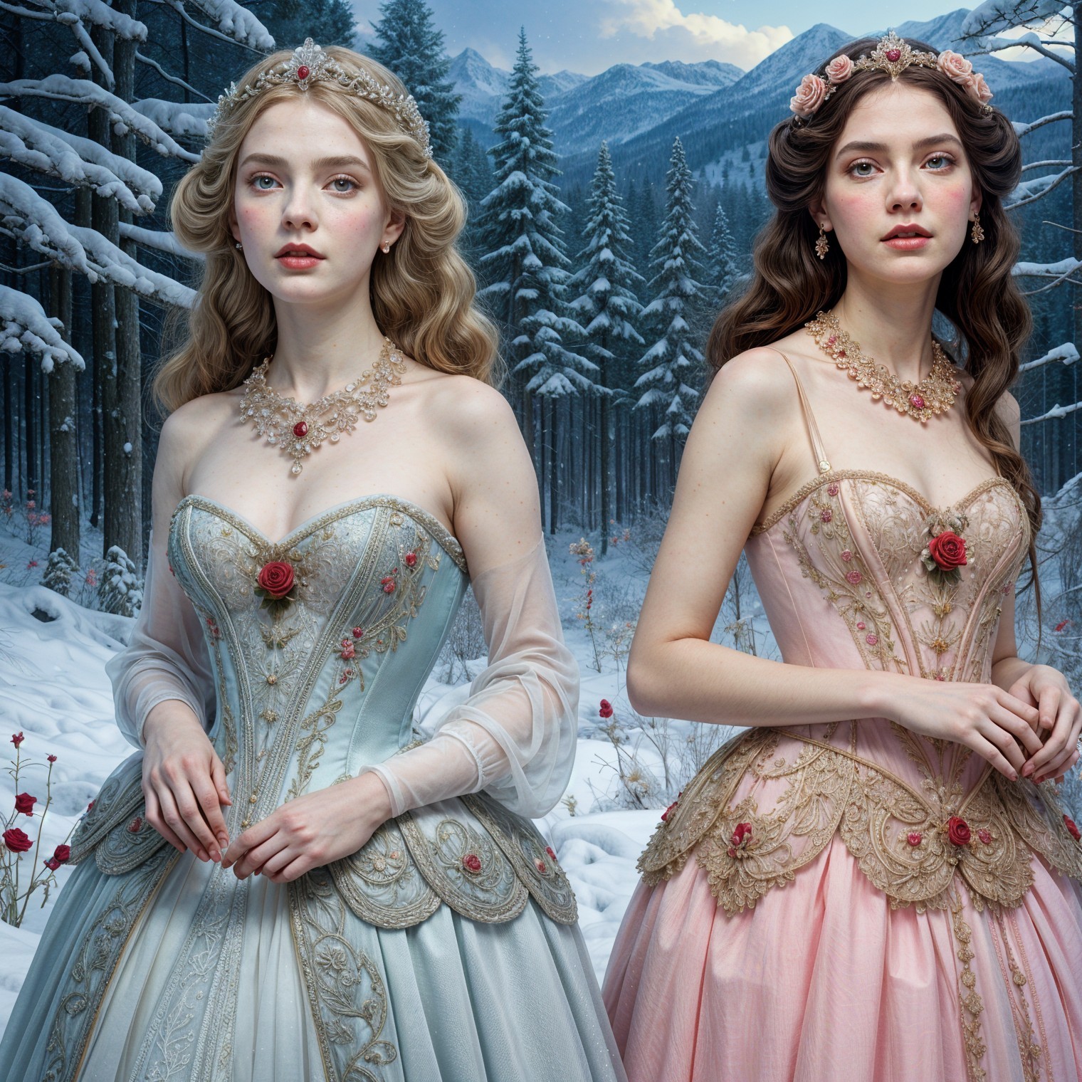 Snow White and Rose Red stand in a snowy forest, wearing beautiful gowns—one in white adorned with gold and roses, the other in pink with intricate embellishments. Their expressions convey grace and poise in this classic fairy tale.