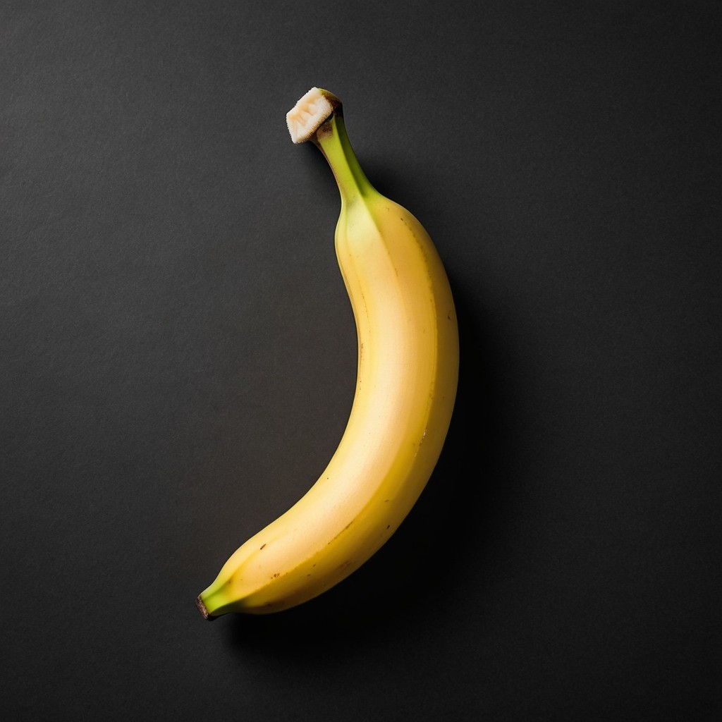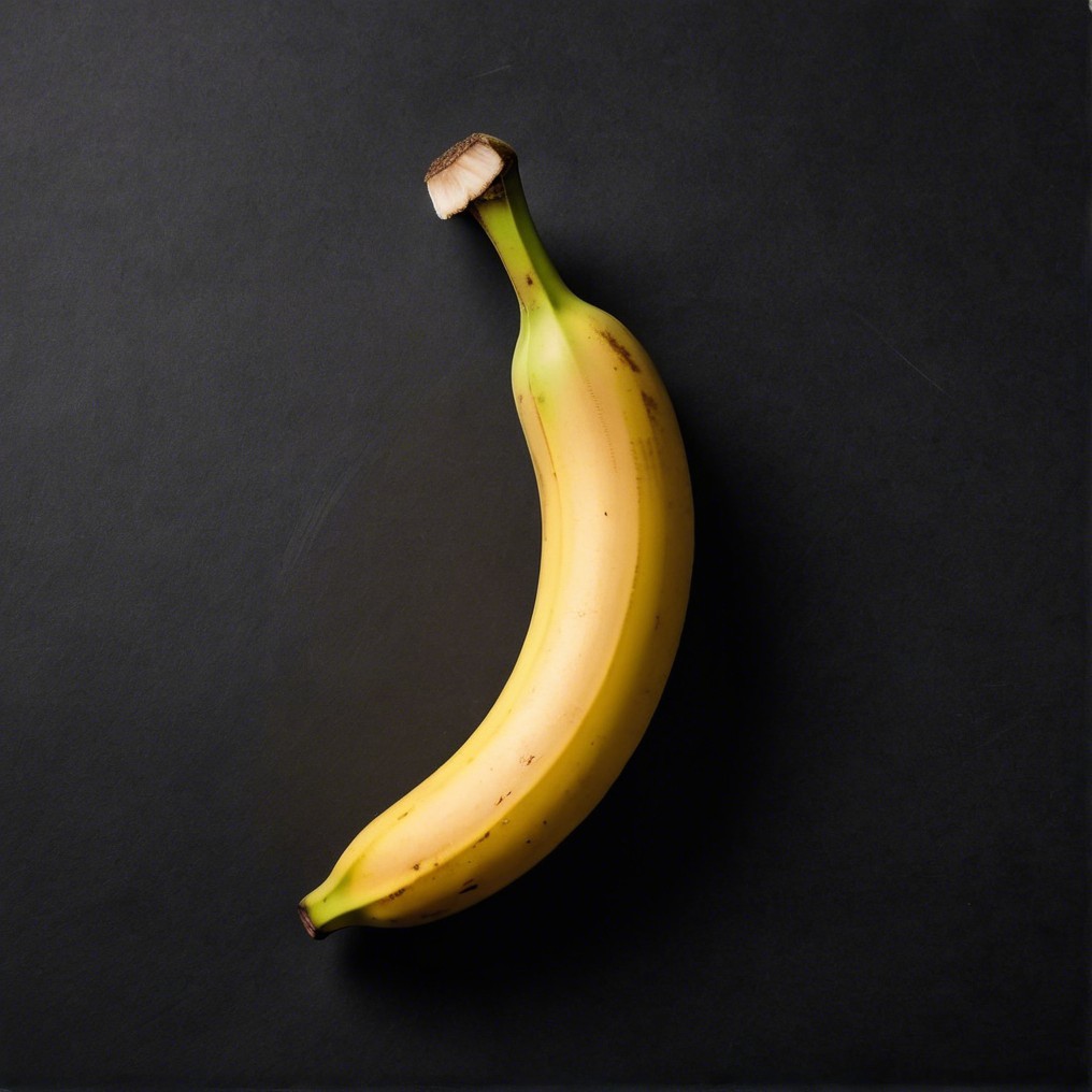 A single ripe banana rests on a dark background, showcasing its vibrant yellow color and subtle brown spots. The image highlights the fruit's smooth texture and curved shape.