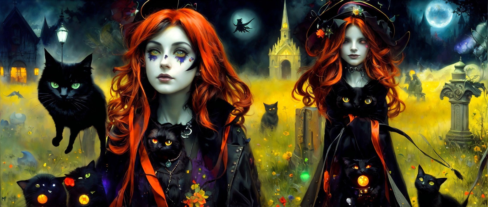 Two women with red hair and gothic attire surrounded by black cats against a moody, fantastical cityscape with a full moon.