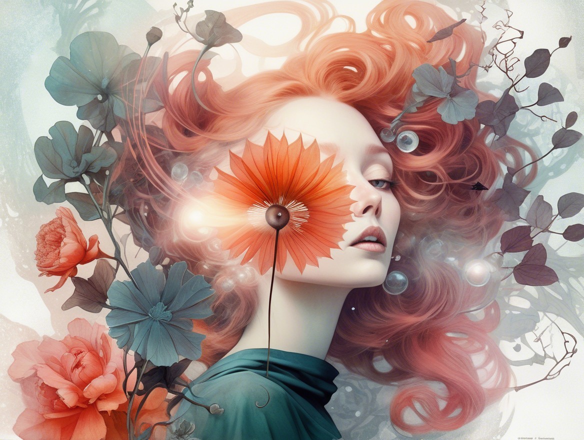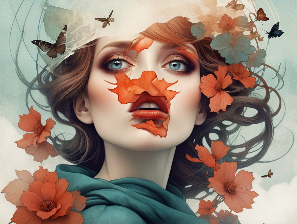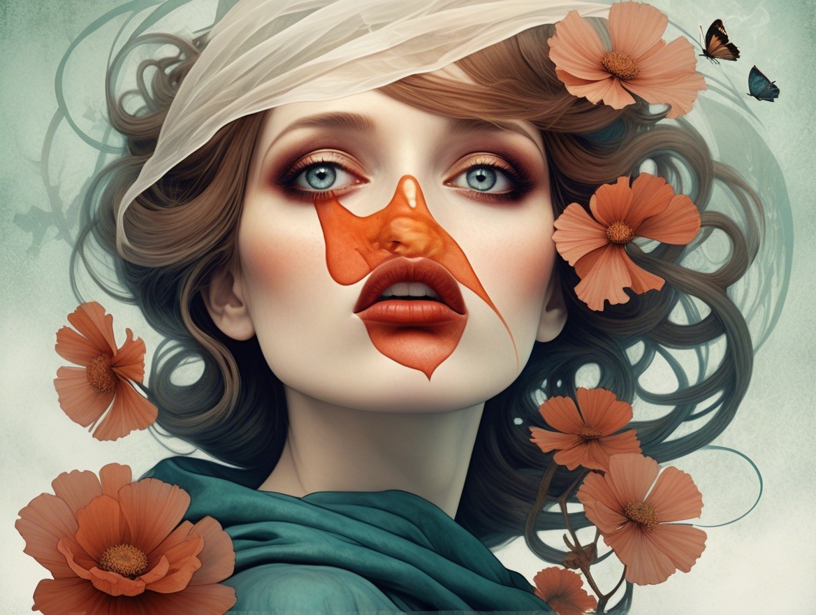 A captivating portrait of a woman with striking blue eyes and bold red lips, adorned with flowers and a delicate headscarf, exuding elegance and a serene, ethereal vibe.