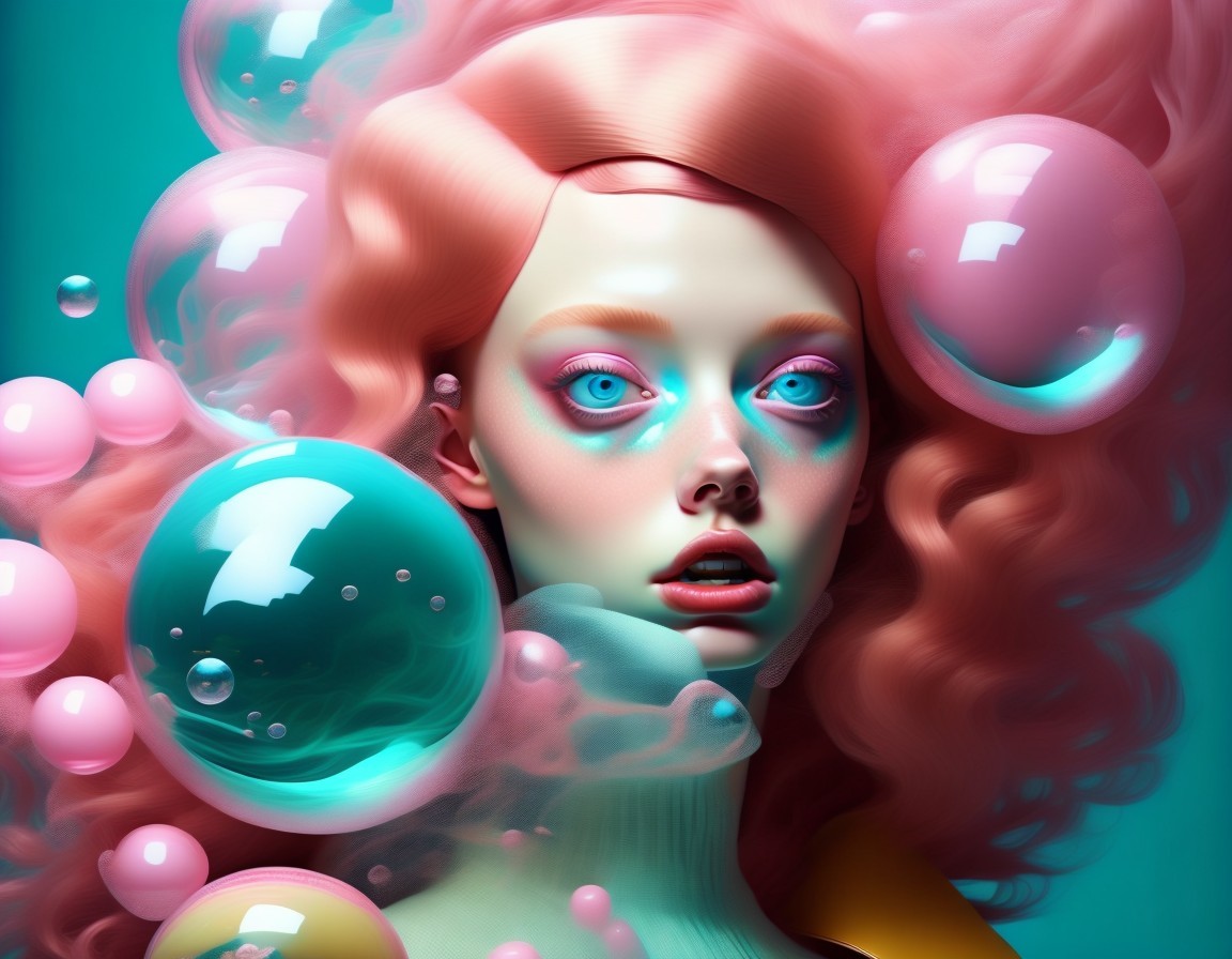 A surreal portrait of a woman with pink hair and floating bubbles in varying hues of pink and teal surrounding her head.