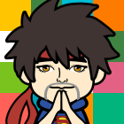 The image features a stylized character with spiky black hair, a red bandana, and a blue outfit with a superhero emblem. The background is colorful and geometric, enhancing the playful aesthetic.