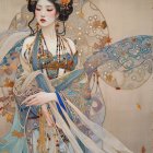 A graceful woman in a colorful, flowing kimono stands against a serene landscape, featuring mountains and fields. Her hair is adorned with flowers, embodying elegance and tranquility.