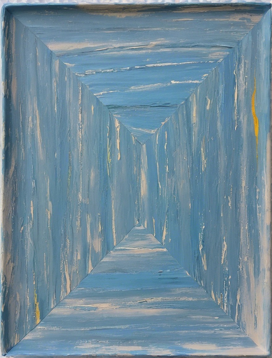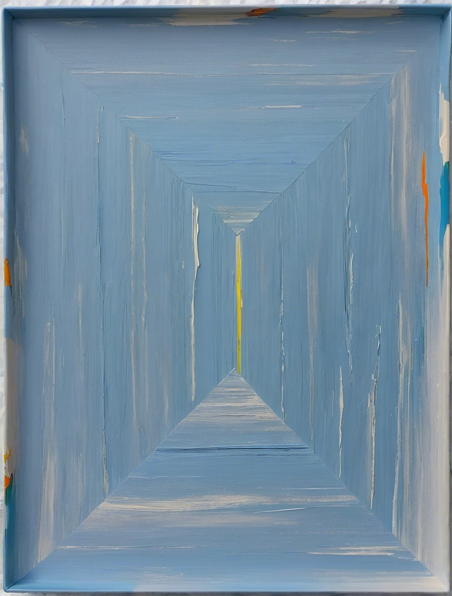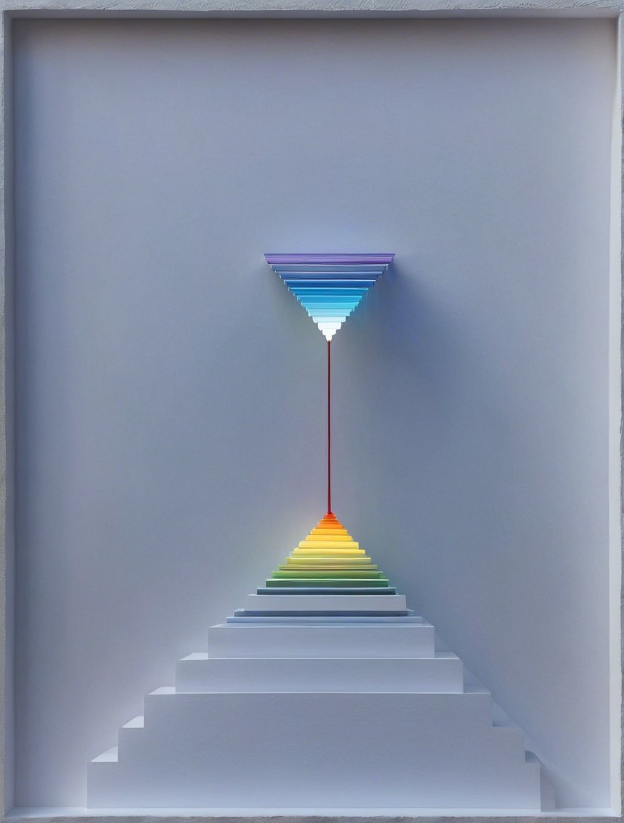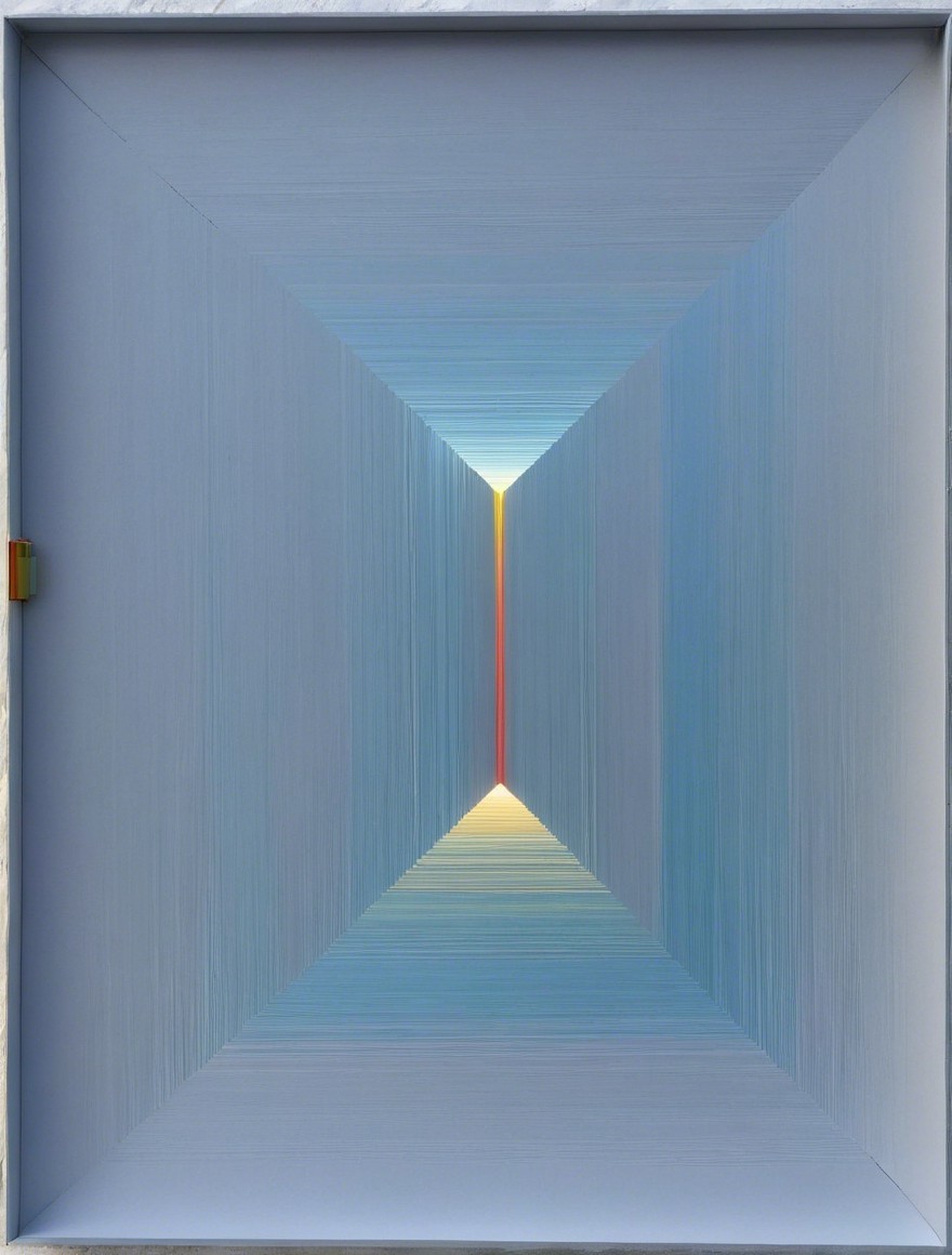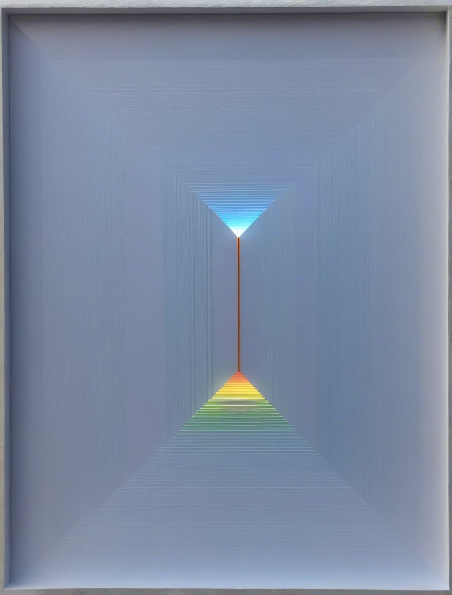 This artwork features a geometric design with a gradient of soft colors transitioning from gray to vibrant hues at the center, creating a sense of depth and movement within a minimalist frame.