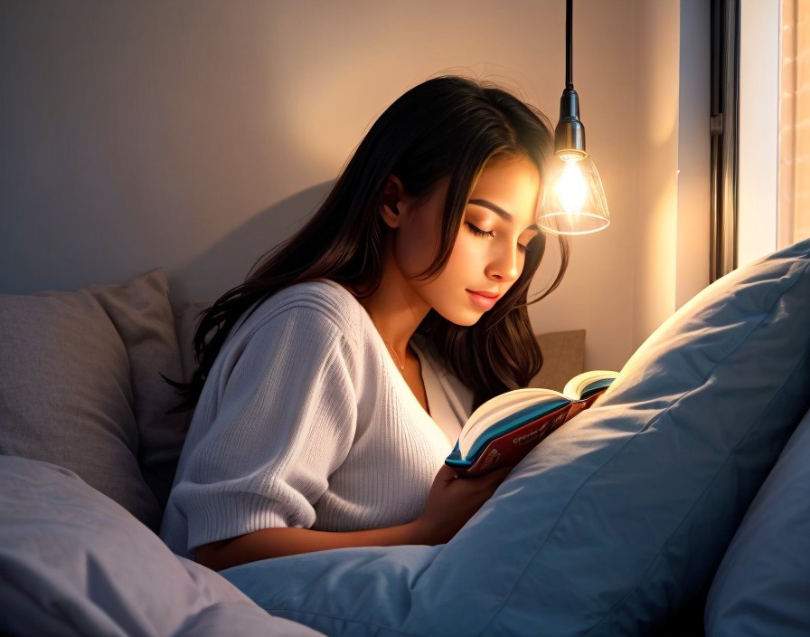 Woman Reading Book in Bed Under Warm Light