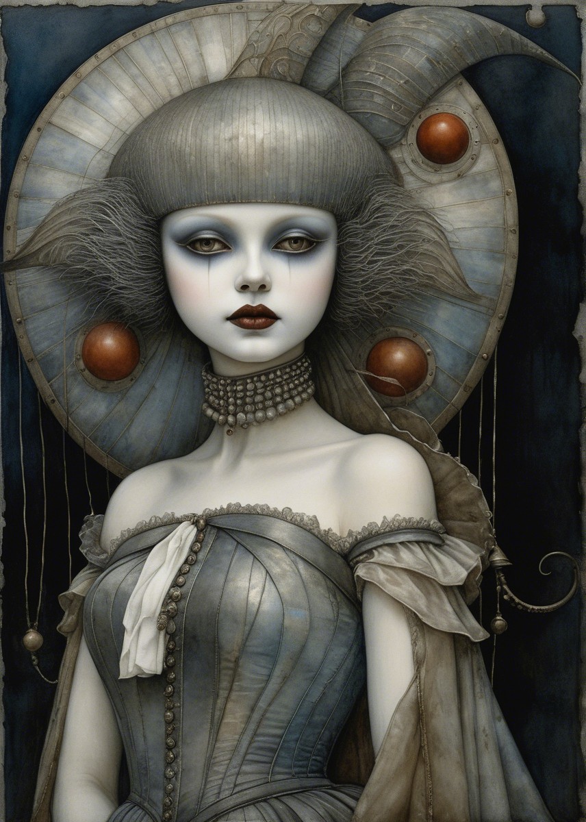 A striking figure in a dramatic, pale dress, featuring elaborate ruffles and a large, intricate headdress. The expression is serene yet haunting, with muted colors emphasizing a surreal beauty.
