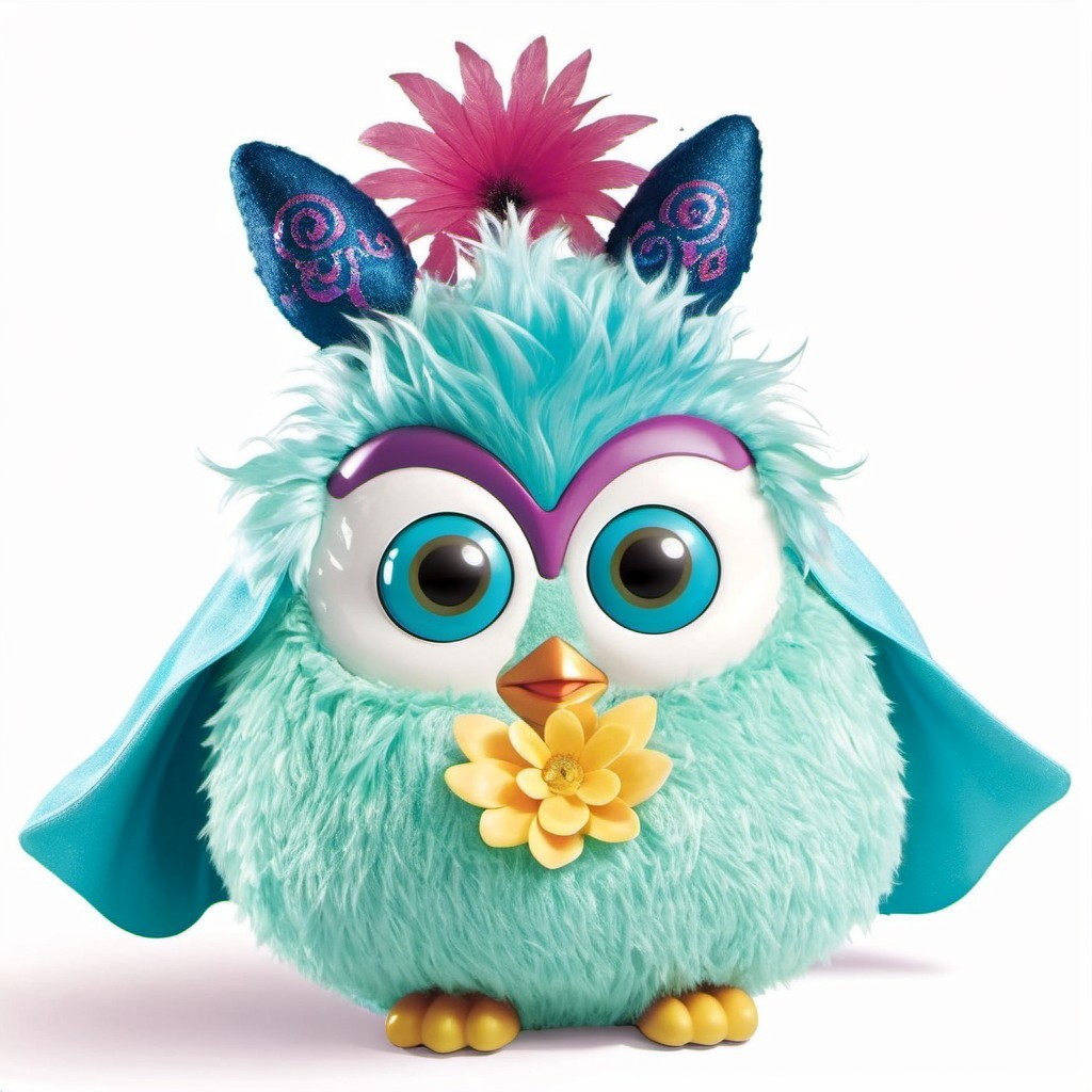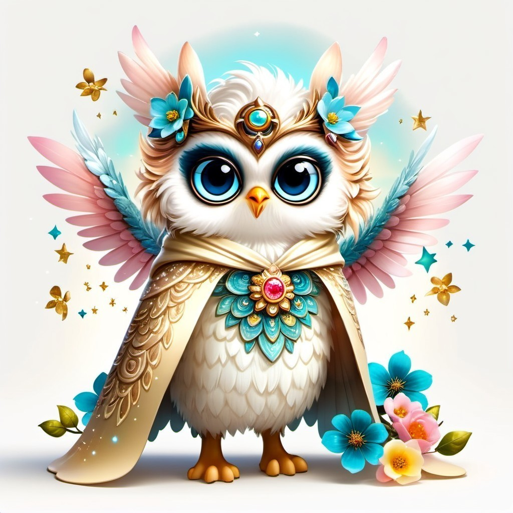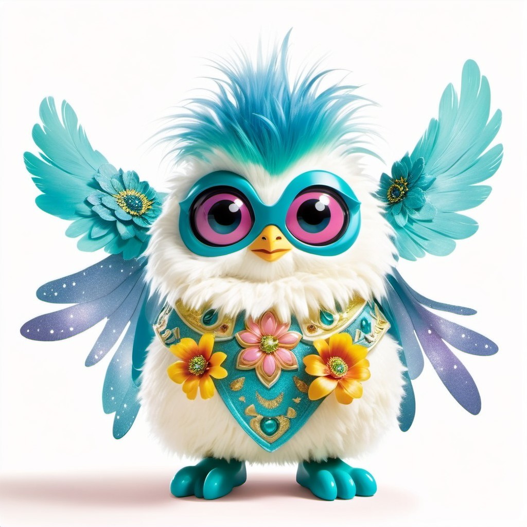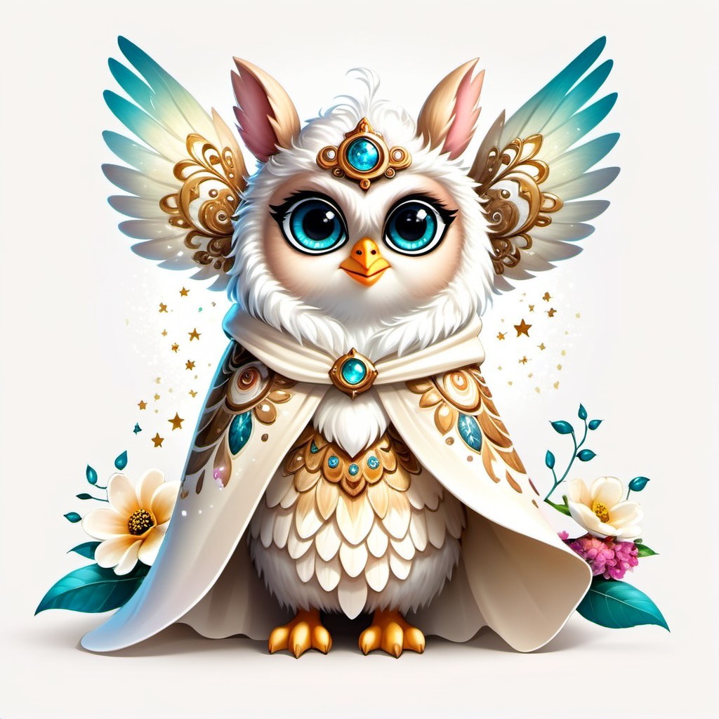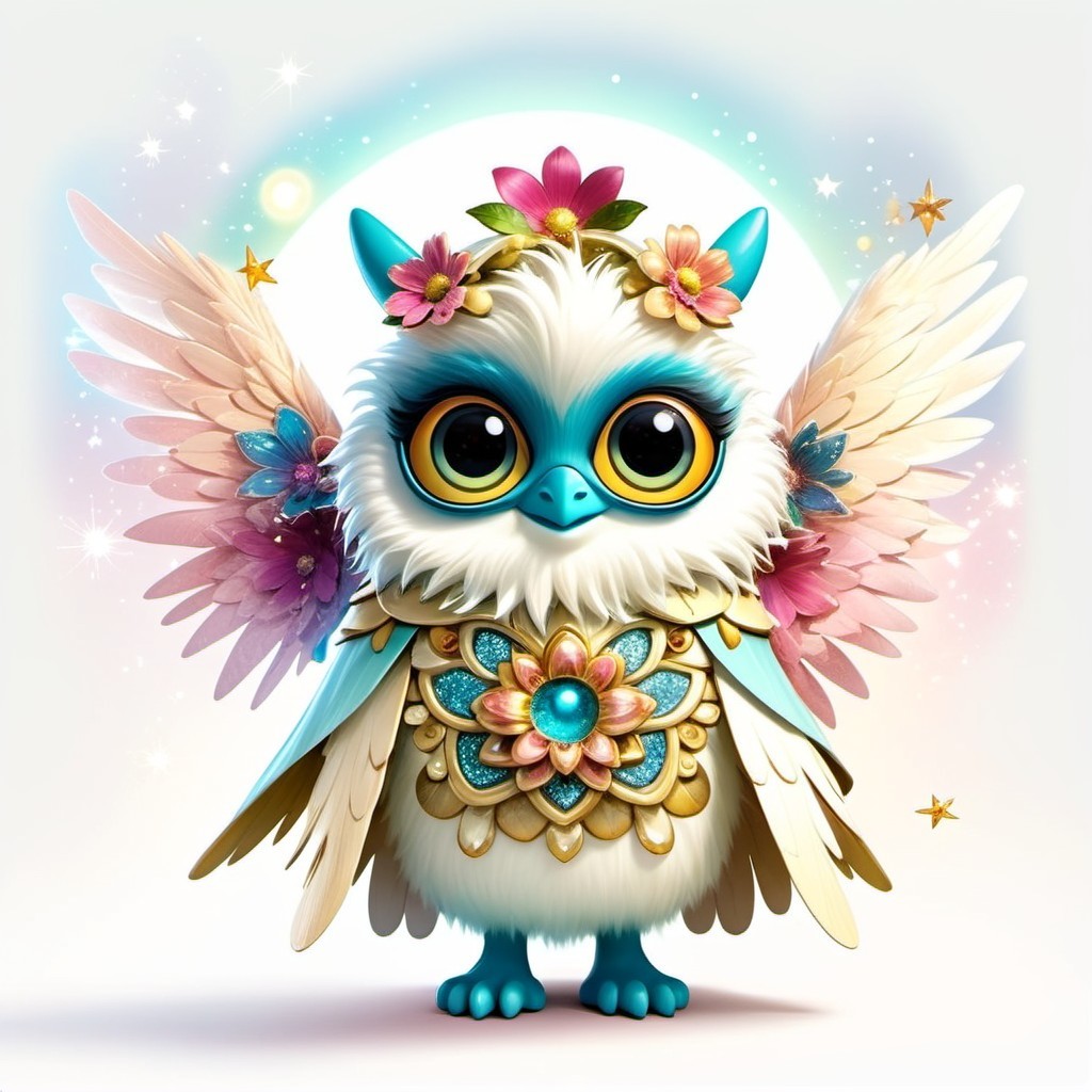 An ornately designed illustration of a stylized furby with large eyes, adorned with gemstones, feathers, and floral motifs in a symmetrical arrangement.