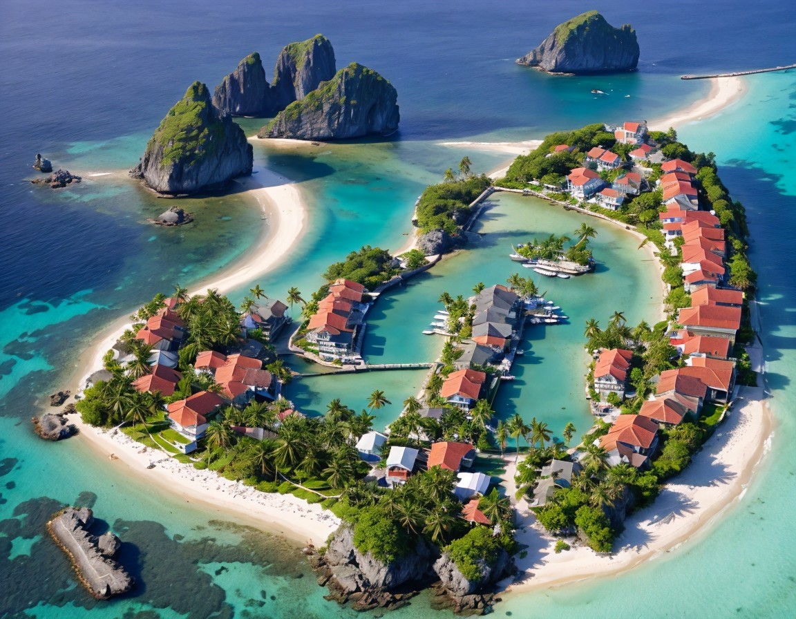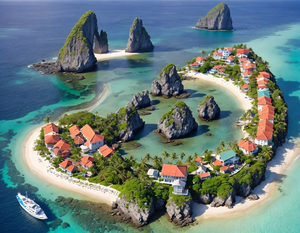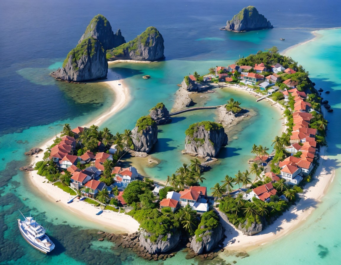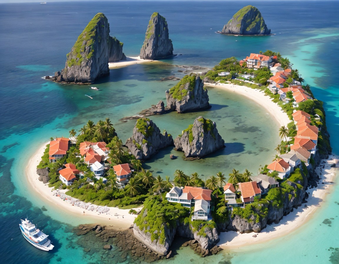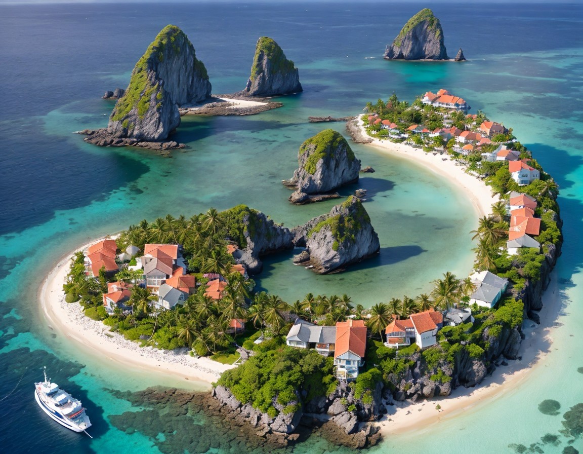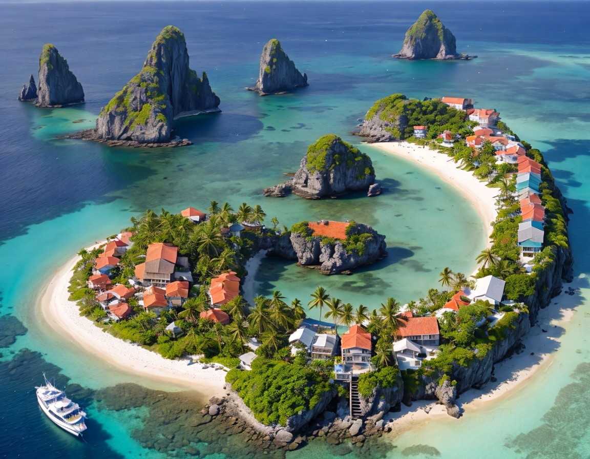 A stunning aerial view of a tropical island resembling a heart shape, surrounded by turquoise waters, lush greenery, and rocky outcrops, dotted with charming homes and boats.