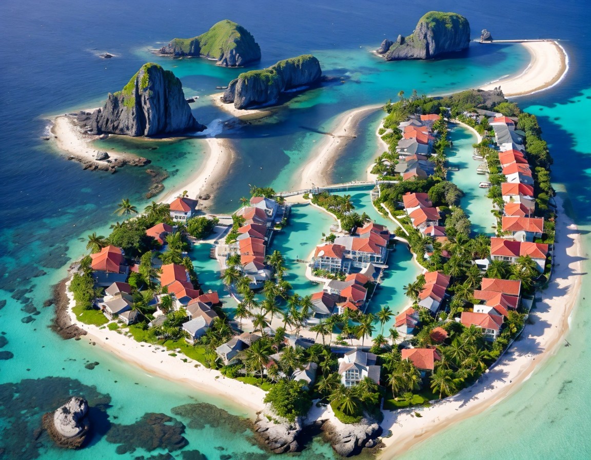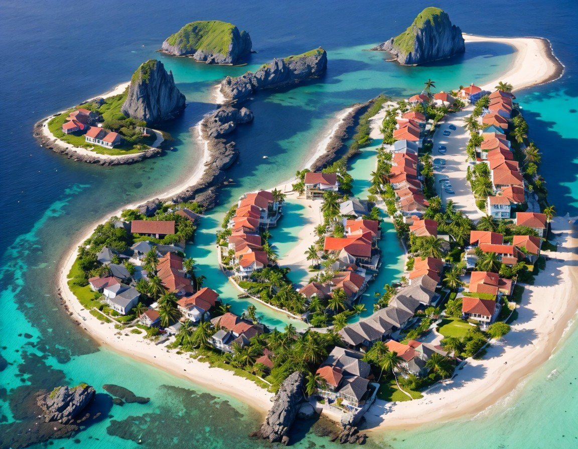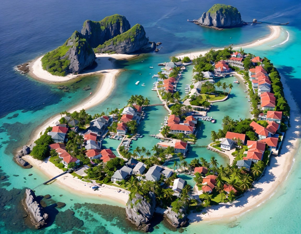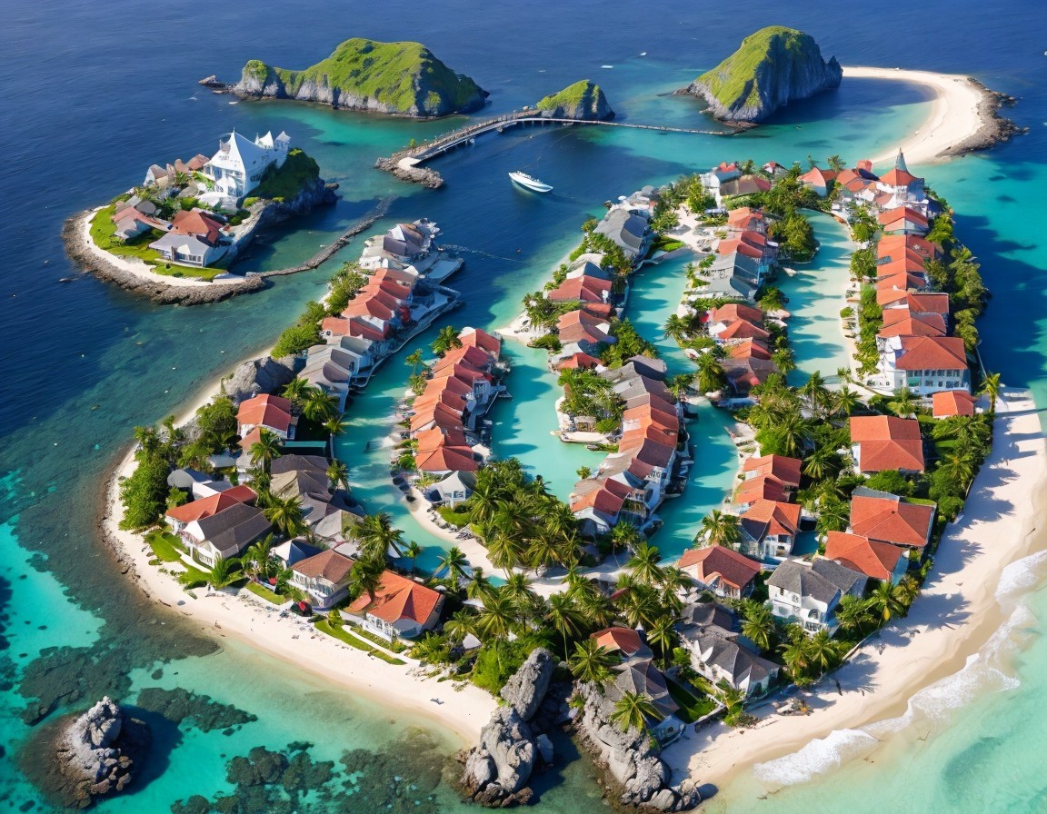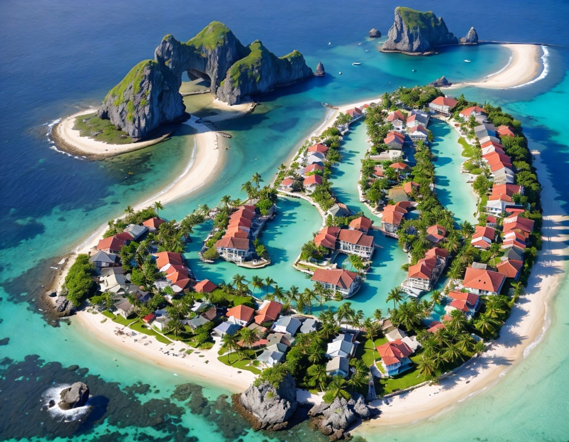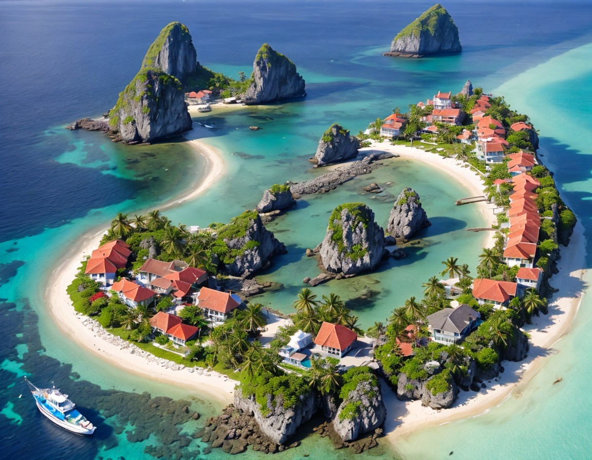 A stunning aerial view of a tropical island resembling a heart shape, surrounded by turquoise waters, lush greenery, and rocky outcrops, dotted with charming homes and boats.