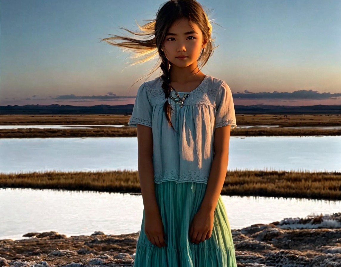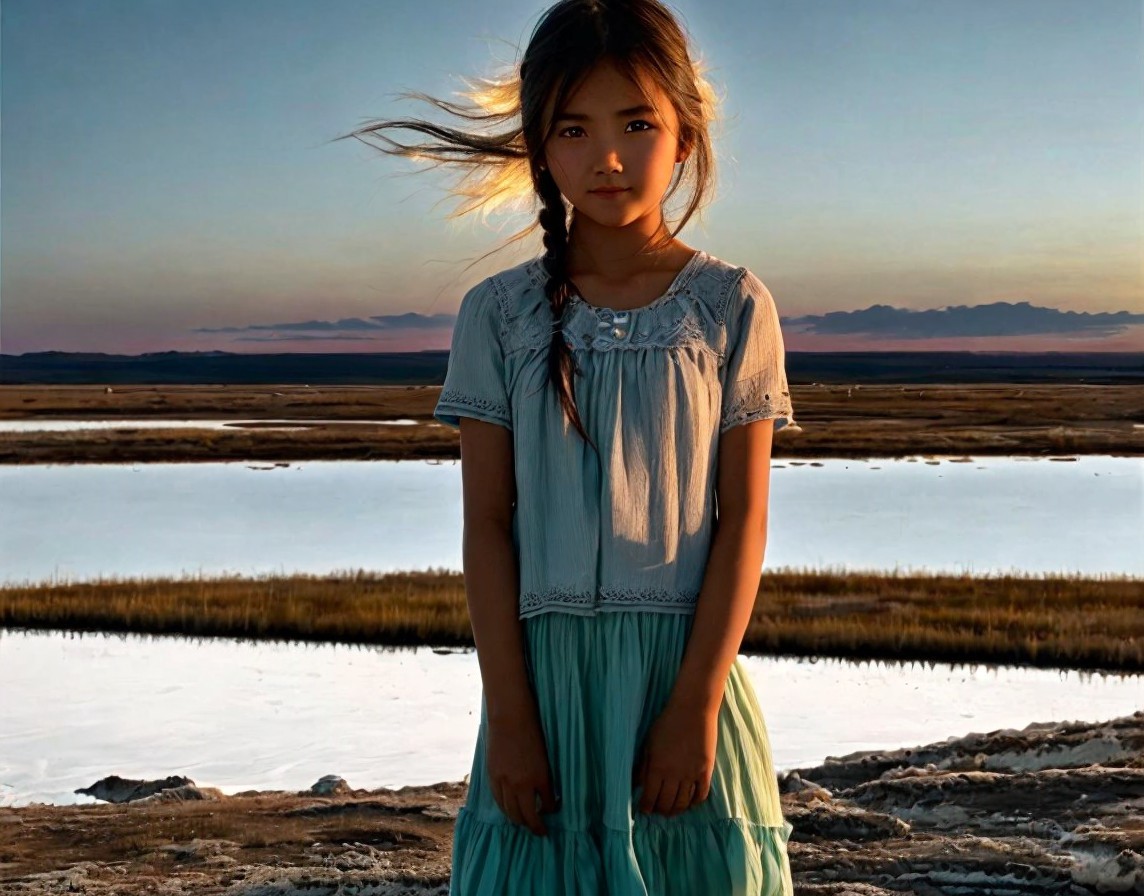 + Prompt:shore of a salt lake amidst the Kazakh Steppe, a tween Kazakh girl standing on a headland overlooking the lake, ((seen from behind)), gazes out towards the water's edge, a bit windy, girl's clothes and long wavy hair are waving in the wind, beginning of the sunset, setting sun casting a warm glow, style of Louis Comfort Tiffany, style of Lovis Corinth