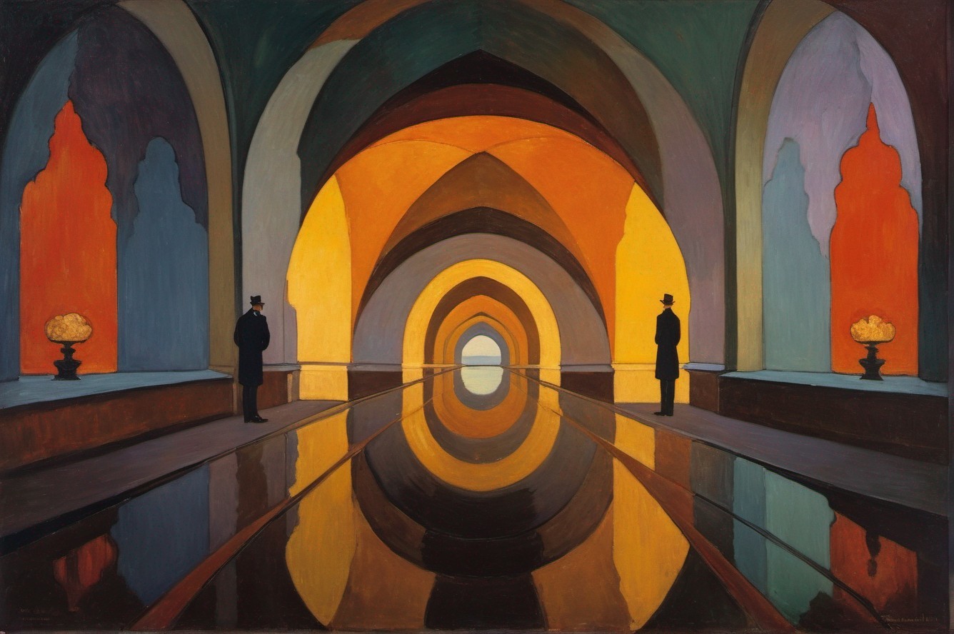A painting depicting two figures standing in a surreal, arch-lined hallway with a vanishing point and reflections on the floor.