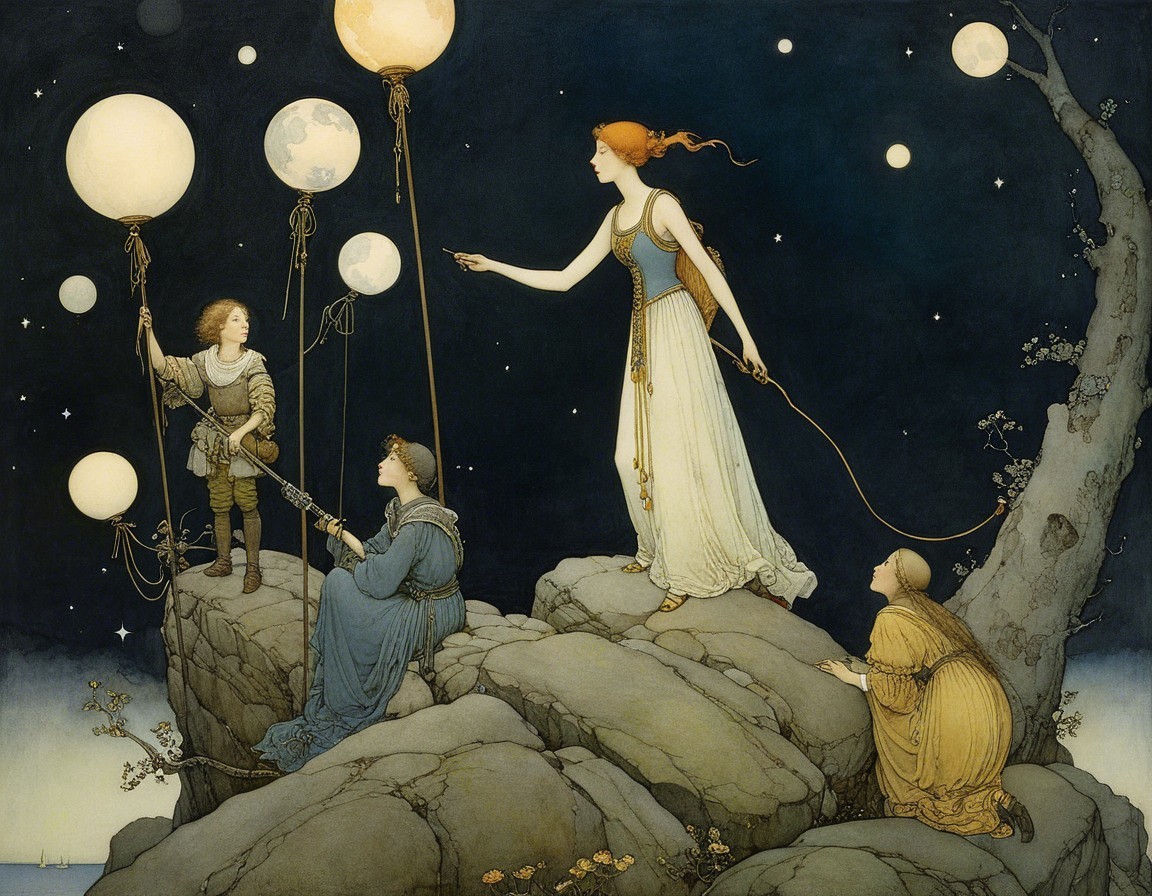 The image depicts two ethereal figures under a starry night sky. One, in a flowing white gown, stands before the other, who is seated on rocks, both holding books, radiating a sense of mystical connection.
