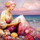 A serene young woman in a flowing, floral dress sits by the ocean, reading a book. The sunset casts a warm glow, enhancing the tranquil atmosphere surrounded by flowers.