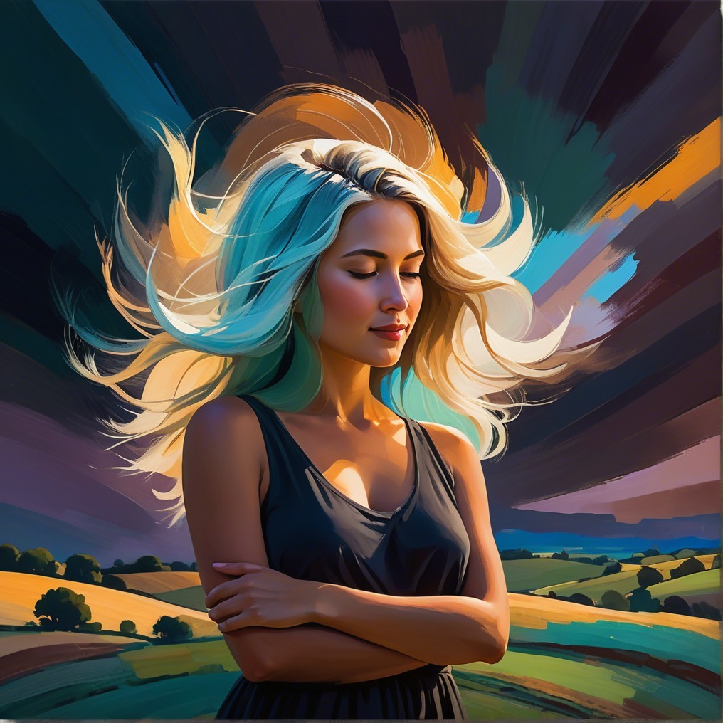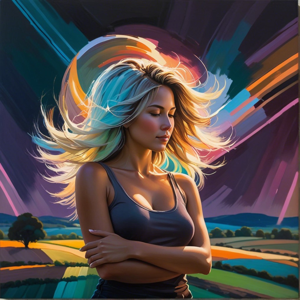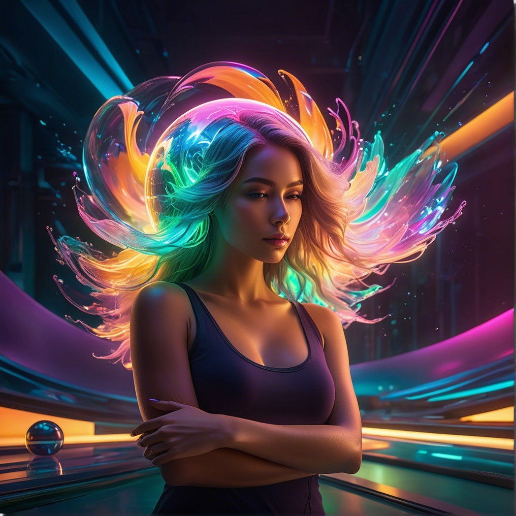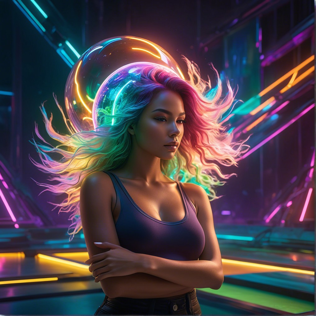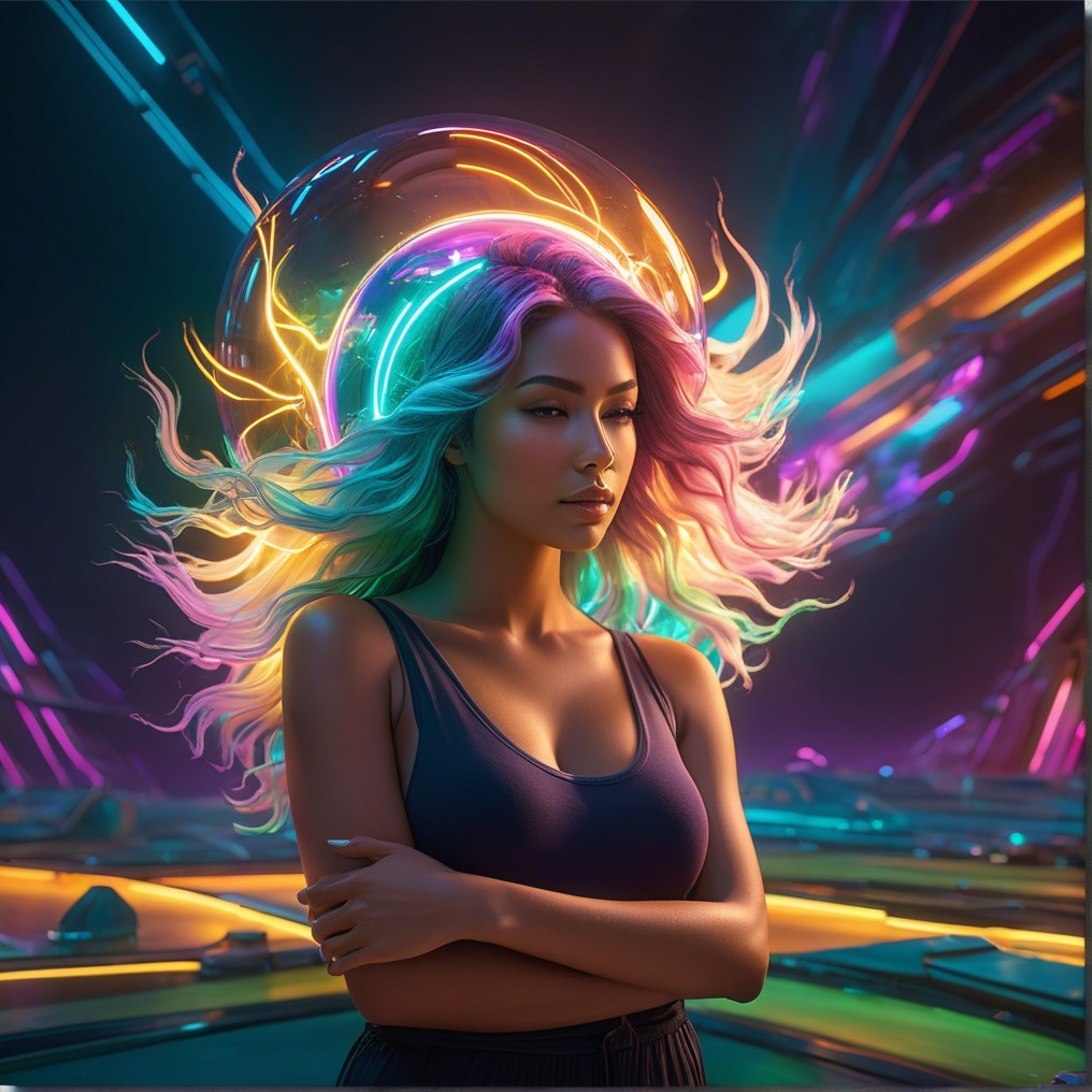 A woman stands confidently in a futuristic setting, illuminated by vibrant neon colors. Behind her, a glowing orb creates a striking visual effect, adding to the modern atmosphere.
