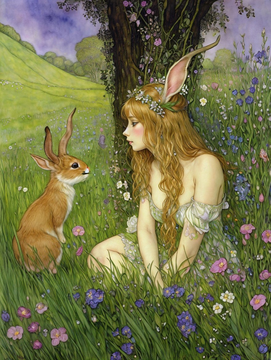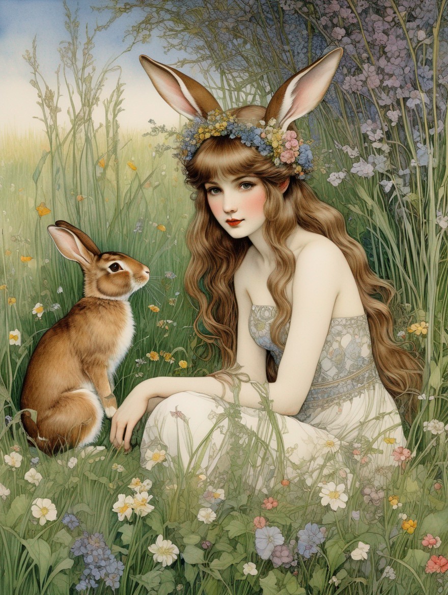 A whimsical illustration of a woman with rabbit ears sitting in a flower field beside a real rabbit, blending fantasy and nature.