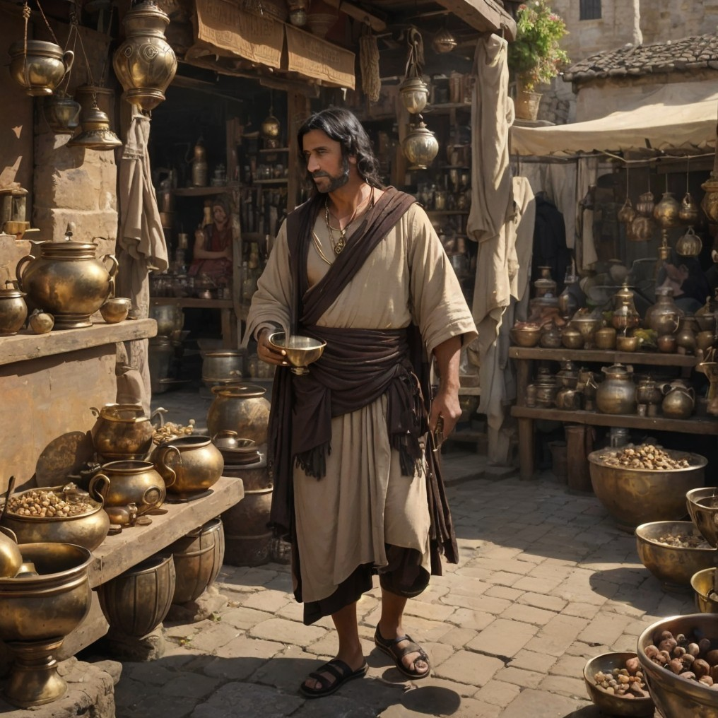 Prompt: A scene from the Bronze Age. A man in a market stall with bronze cauldrons, goblets and jugs. He has dark hair and is dressed in a beige Greek chiton