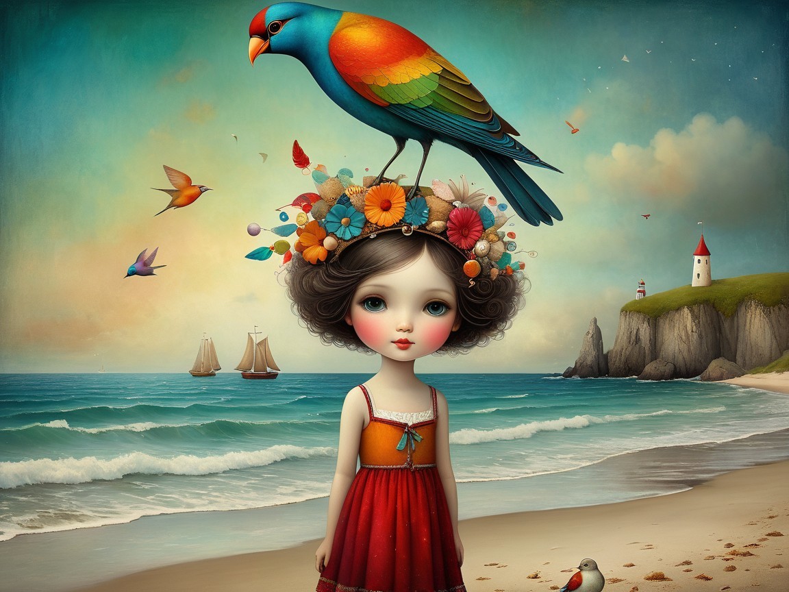 A whimsical scene of a young girl on a beach, adorned with a floral crown and a colorful bird perched on her head. The background features calm waves, sailboats, and a distant lighthouse.