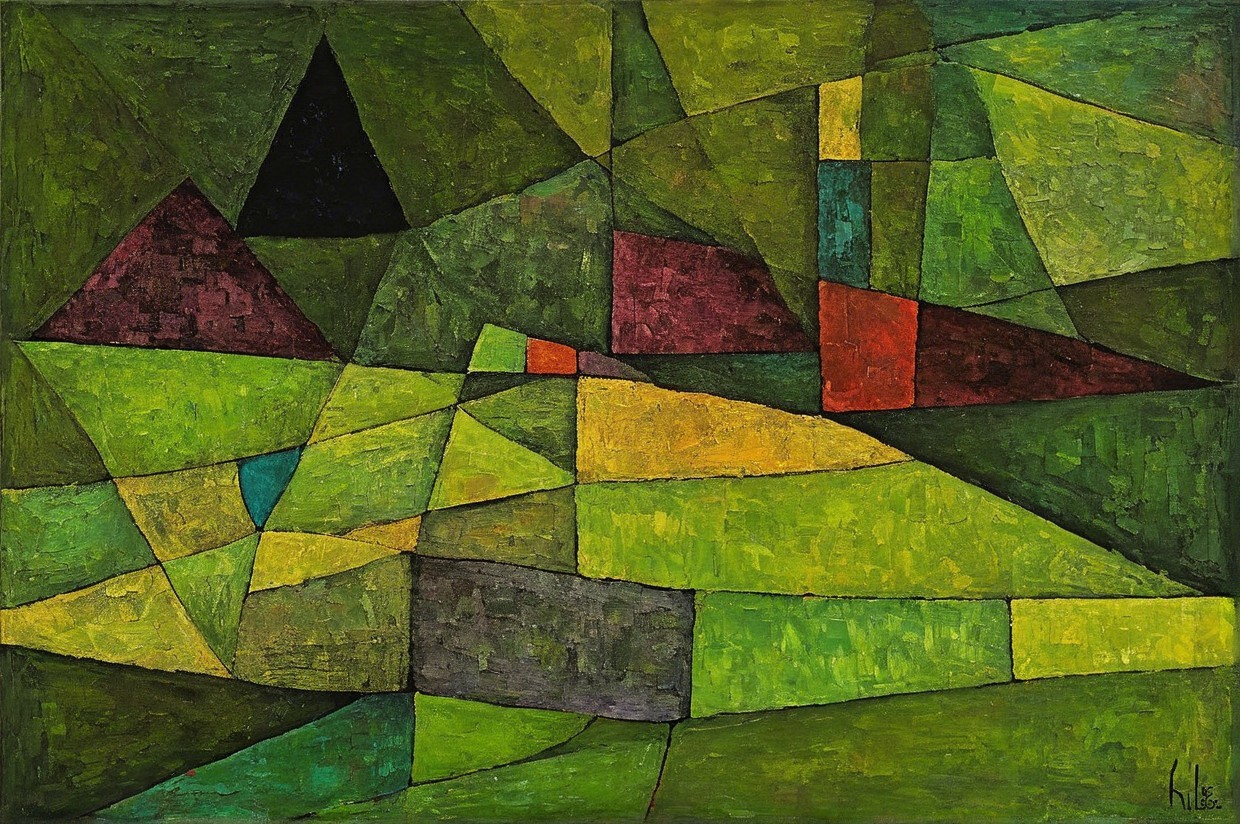 An abstract composition of geometric shapes in (mainly) greens, reds, and purples, creating a dynamic interplay of colour and form evoking peace, depth and movement.