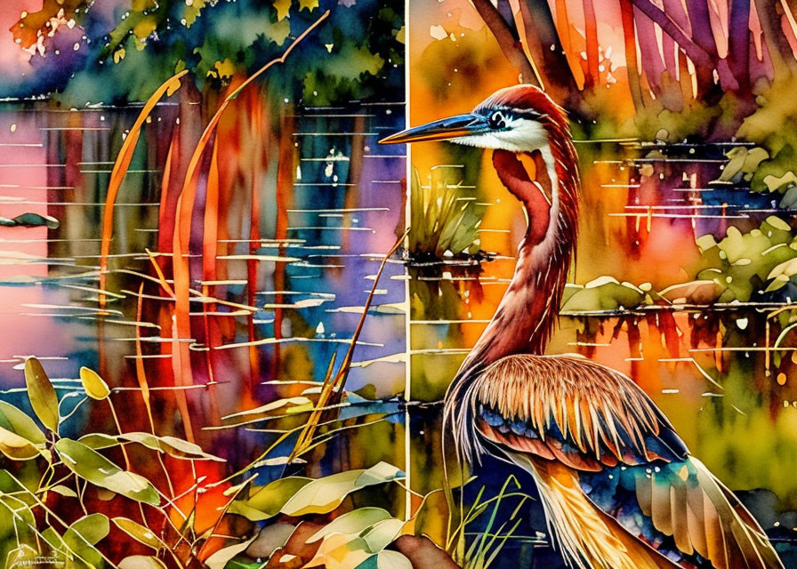 Vibrant digital artwork of heron in reeds and lily pads at dusk.