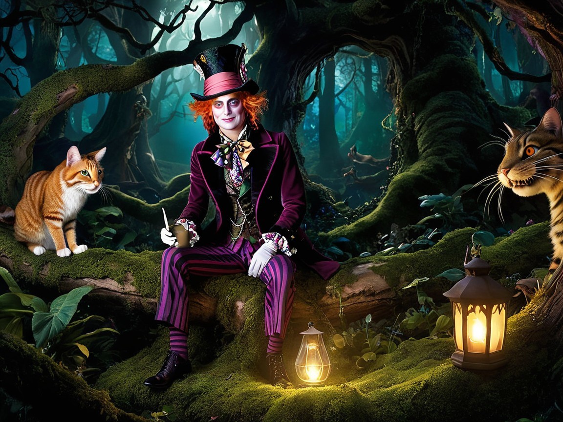 The mad hatter in a top hat sits on a mossy log surrounded by a magical forest, flanked by curious cats and glowing lanterns, creating an enchanting atmosphere.