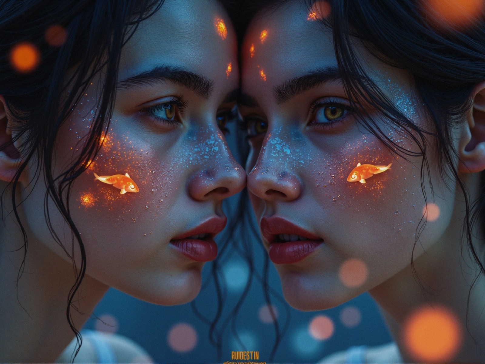 A close-up of a man and woman gazing intensely at each other. Their faces are adorned with shimmering patterns, and tiny goldfish swim around them, creating a dreamy, surreal atmosphere.