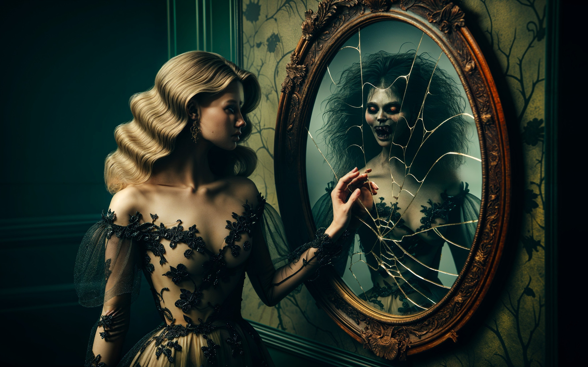 A woman in a vintage dress looks at her reflection which shows a scary, monstrous version of herself in a cracked mirror.