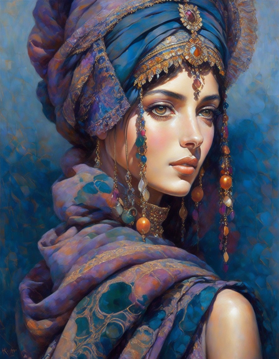 A painting of a woman with a blue headscarf, adorned with jewels, and matching earrings, showcasing her captivating gaze and elegant pose.
